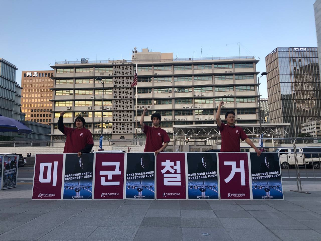 16일 민중민주당(민중당)은 미대사관앞에서 <친미호전윤석열타도! 북침핵전쟁책동중단! 핵전쟁화근 미군철거!> 구호를 들고 평화시위를 2523일째 전개했다.