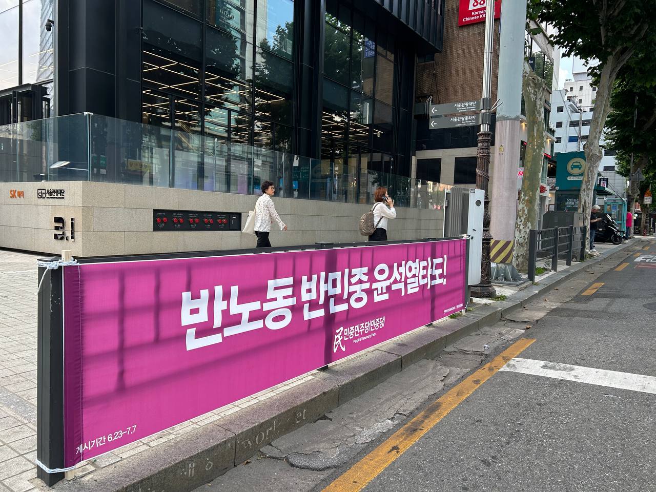 정당연설회 민중민주당 종로일대 〈윤석열타도!〉가로막게시 2023년 6월 23일 FacebookTwitter 23일 민중민주당(민중당)은 종로2~3가일대에 <노조탄압 파쇼독재 윤석열타도!>, <반민중재벌자산환수! 민중복지실현!>, <노동개악저지! 비정규직철폐!>, <반노동 반민중 윤석열타도!>, <친일매국 전쟁동맹 윤석열타도!>, <친일매국 파쇼호전 윤석열타도!> 가로막을 내걸었다.
