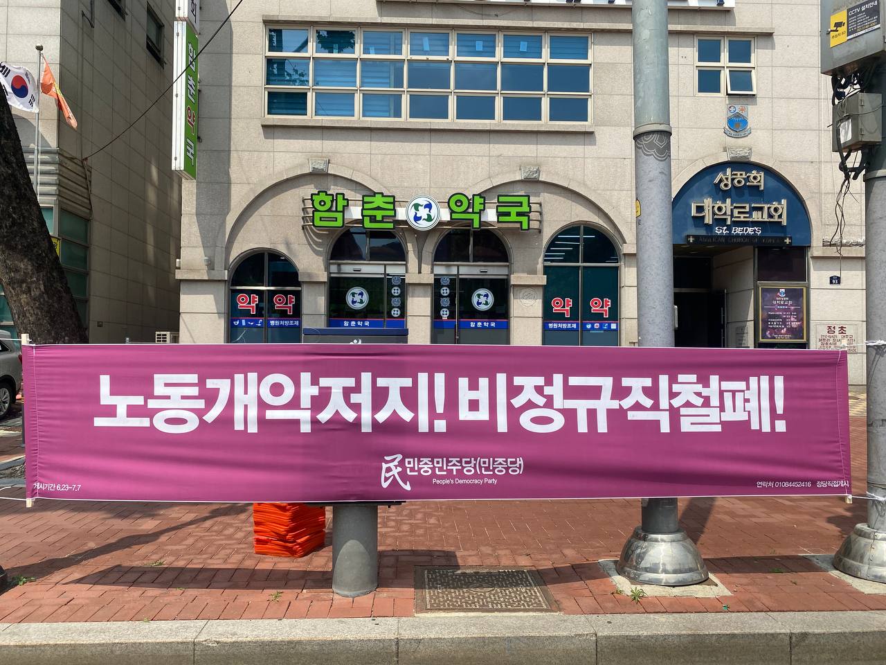 정당연설회 민중민주당, 을지로·혜화일대 〈윤석열타도!〉가로막게시 2023년 6월 26일 FacebookTwitter 24일 민중민주당(민중당)은 서울 시청-을지로입구역, 노동자대회가 열리는 혜화역일대에 가로막 <노조탄압 파쇼독재 윤석열타도!>, <반민중재벌자산환수! 민중복지실현!>, <노동개악저지! 비정규직철폐!>, <반노동 반민중 윤석열타도!>, <친일매국 파쇼호전 윤석열타도!>, <친일매국 친미호전 윤석열타도!>, <친일매국 전쟁책동 윤석열타도!>, <친일매국 전쟁동맹 윤석열타도!>, <친일매국 북침연습 윤석열타도!>를 내걸었다.
