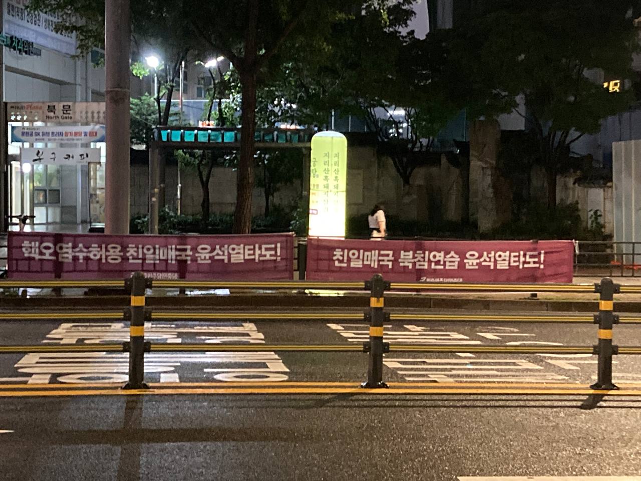 정당연설회 민중민주당 안국역일대 가로막게시 〈핵오염수허용 친일매국 윤석열타도!〉 2023년 6월 30일 FacebookTwitter 29일 민중민주당(민중당)은 안국역일대에 <핵오염수허용 친일매국 윤석열타도!>, <친일매국 전쟁책동 윤석열타도!>, <친일매국 친미호전 윤석열타도!>, <친일매국 북침연습 윤석열타도!> 가로막을 게시했다.