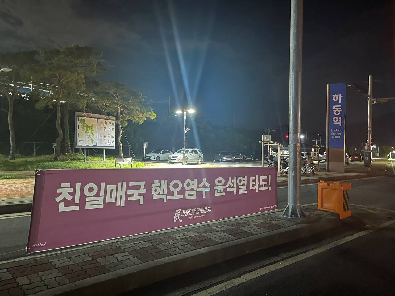 2일 민중민주당(민중당)은 경북 성주시와 경남 하동역, 남해공용터미널, 사천시청, 고성군청, 통영종합버스터미널, 거제시청, 진주역 등 7개시군별 거점에 <친일매국 핵오염수 윤석열 타도!> 가로막을 게시했다.
