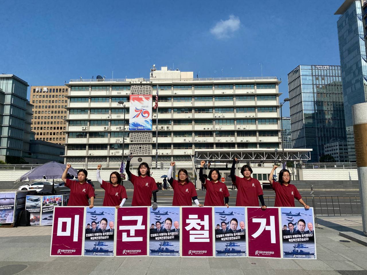 10일 민중민주당(민중당)은 미대사관앞에서 <친미호전윤석열타도! 북침핵전쟁책동중단! 핵전쟁화근 미군철거!> 구호를 들고 평화시위를 2547일째 전개했다.