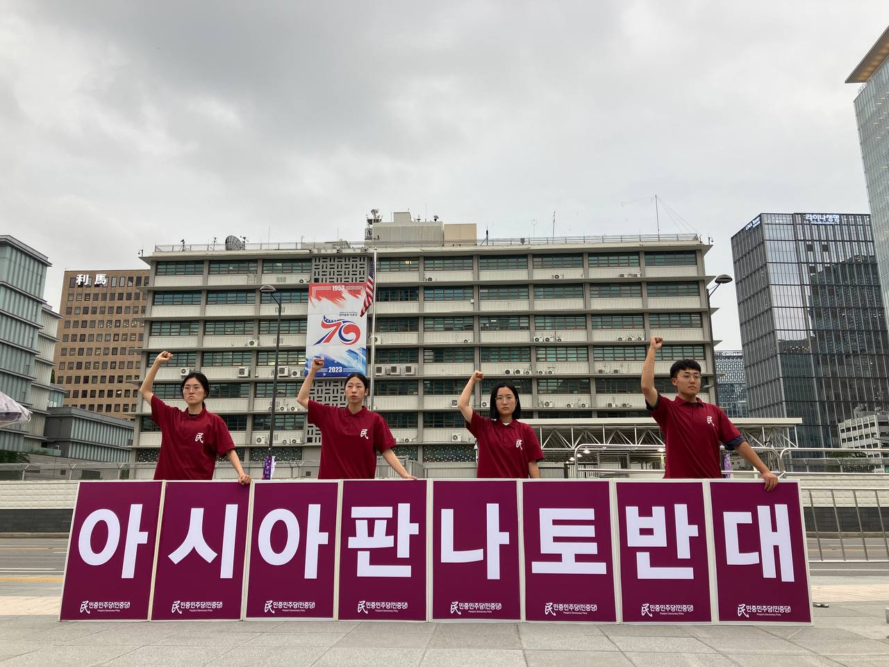 민중민주당학생당원은 <윤석열은 기어이 제국주의전쟁동맹인 나토정상회의에 참여하여 우크라이나전에 적극적으로 가담하는 모습을 노골적으로 표하고 있다>며 <미제국주의의 하수인답게 아시아판 나토인 <3각군사동맹>을 강화하며 북침전쟁을 획책하기 위해 골몰하고 있고, 자신들의 침략야욕을 위한 동맹을 위해서라면 일본의 핵오염수무단방류를 적극 방조하며 우리민중을 배신하고 죽음에 몰아넣는 것이 바로 역대 최악의 사대매국호전광 윤석열이다>라고 힘주어 말했다.
