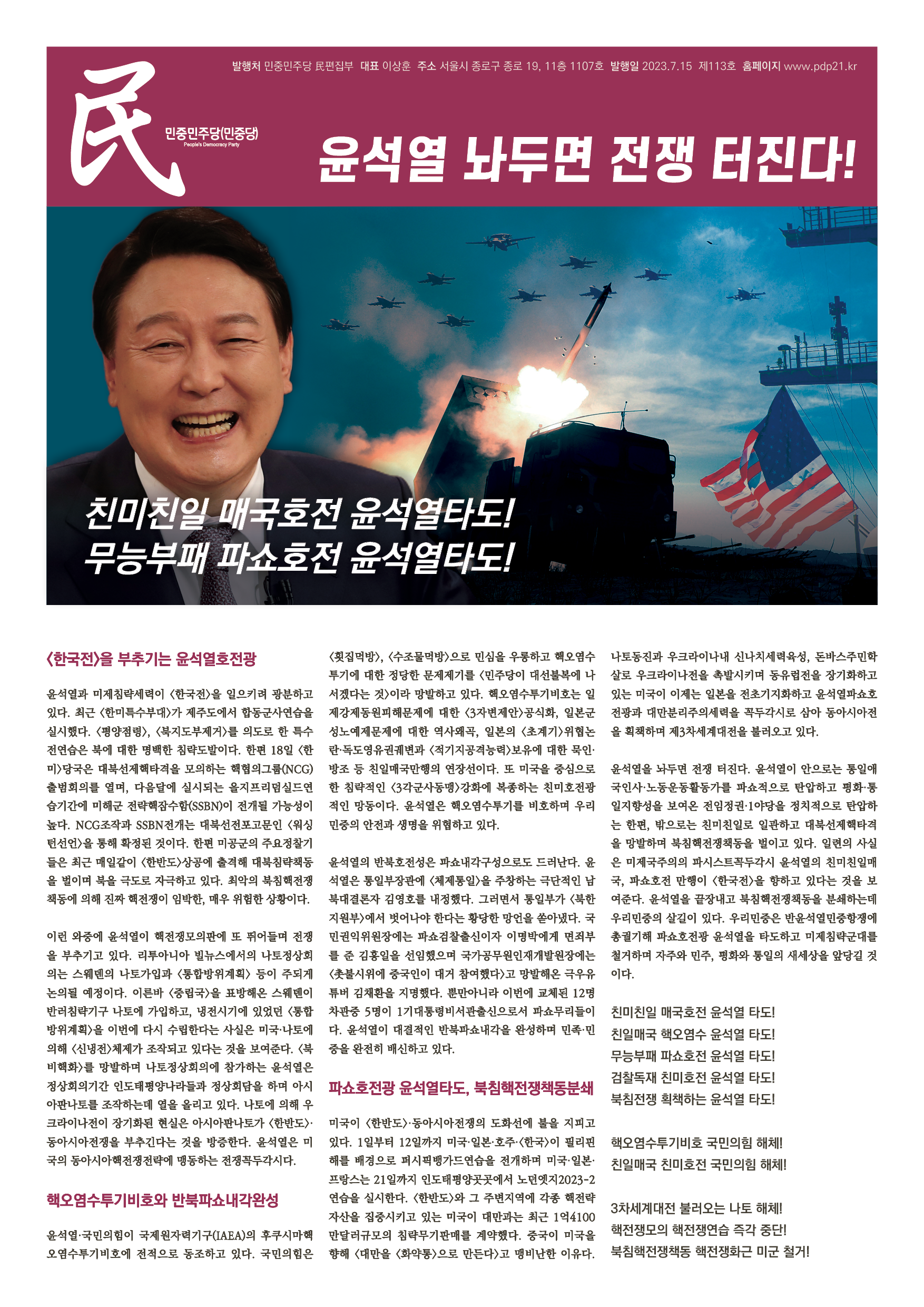 윤석열을 놔두면 전쟁 터진다. 윤석열이 안으로는 통일애국인사·노동운동활동가를 파쇼적으로 탄압하고 평화·통일지향성을 보여온 전임정권·1야당을 정치적으로 탄압하는 한편, 밖으로는 친미친일로 일관하고 대북선제핵타격을 망발하며 북침핵전쟁책동을 벌이고 있다. 일련의 사실은 미제국주의의 파시스트꼭두각시 윤석열의 친미친일매국, 파쇼호전 만행이 <한국전>을 향하고 있다는 것을 보여준다. 윤석열을 끝장내고 북침핵전쟁책동을 분쇄하는데 우리민중의 살길이 있다. 우리민중은 반윤석열민중항쟁에 총궐기해 파쇼호전광 윤석열을 타도하고 미제침략군대를 철거하며 자주와 민주, 평화와 통일의 새세상을 앞당길 것이다.