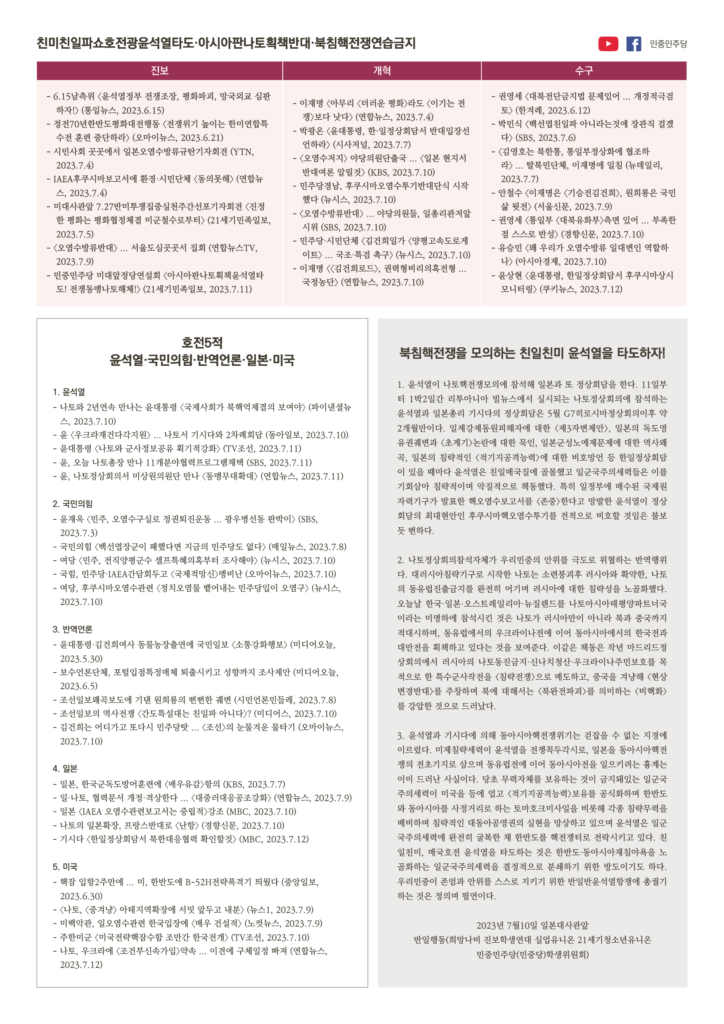 3. 윤석열과 기시다에 의해 동아시아핵전쟁위기는 걷잡을 수 없는 지경에 이르렀다. 미제침략세력이 윤석열을 전쟁꼭두각시로, 일본을 동아시아핵전쟁의 전초기지로 삼으며 동유럽전에 이어 동아시아전을 일으키려는 흉계는 이미 드러난 사실이다. 당초 무력자체를 보유하는 것이 금지돼있는 일군국주의세력이 미국을 등에 업고 <적기지공격능력>보유를 공식화하며 한반도와 동아시아를 사정거리로 하는 토마호크미사일을 비롯해 각종 침략무력을 배비하며 침략적인 대동아공영권의 실현을 망상하고 있으며 윤석열은 일군국주의세력에 완전히 굴복한 채 한반도를 핵전쟁터로 전락시키고 있다. 친일친미, 매국호전 윤석열을 타도하는 것은 한반도·동아시아재침야욕을 노골화하는 일군국주의세력을 결정적으로 분쇄하기 위한 방도이기도 하다. 우리민중이 존엄과 안위를 스스로 지키기 위한 반일반윤석열항쟁에 총궐기하는 것은 정의며 필연이다.