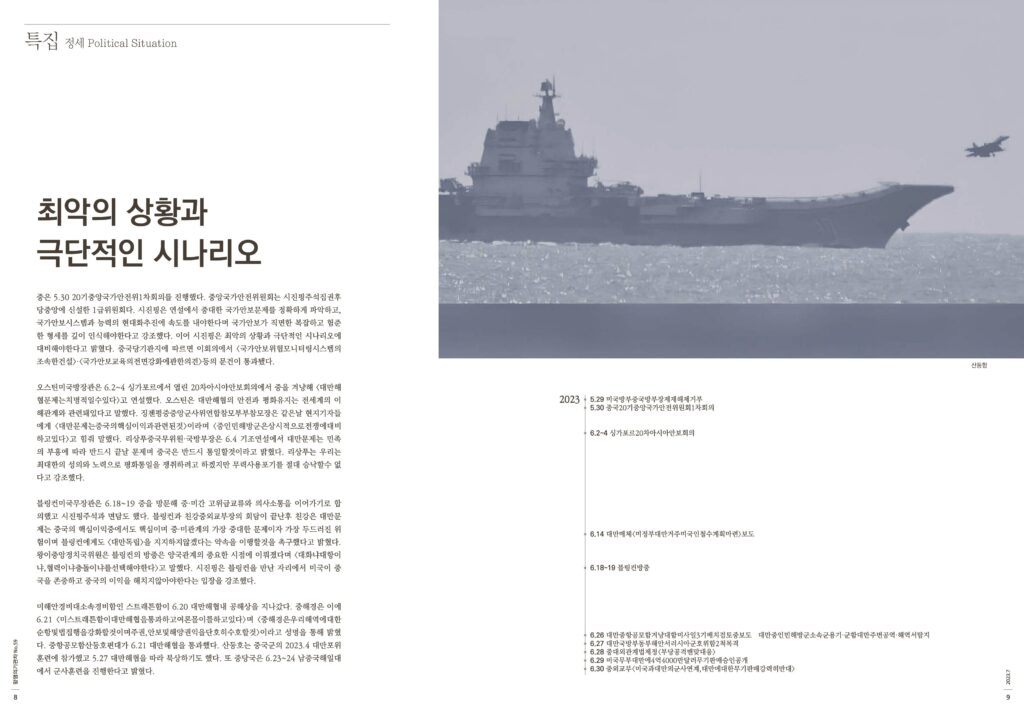 미해안경비대소속경비함인 스트래튼함이 6.20 대만해협내 공해상을 지나갔다. 중해경은 이에 6.21 <미스트래튼함이대만해협을통과하고여론몰이를하고있다>며 <중해경은우리해역에대한순항및법집행을강화할것이며주권,안보및해양권익을단호히수호할것>이라고 성명을 통해 밝혔다. 중항공모함산둥호편대가 6.21 대만해협을 통과했다. 산둥호는 중국군의 2023.4 대만포위훈련에 참가했고 5.27 대만해협을 따라 북상하기도 했다. 또 중당국은 6.23~24 남중국해일대에서 군사훈련을 진행한다고 밝혔다.
