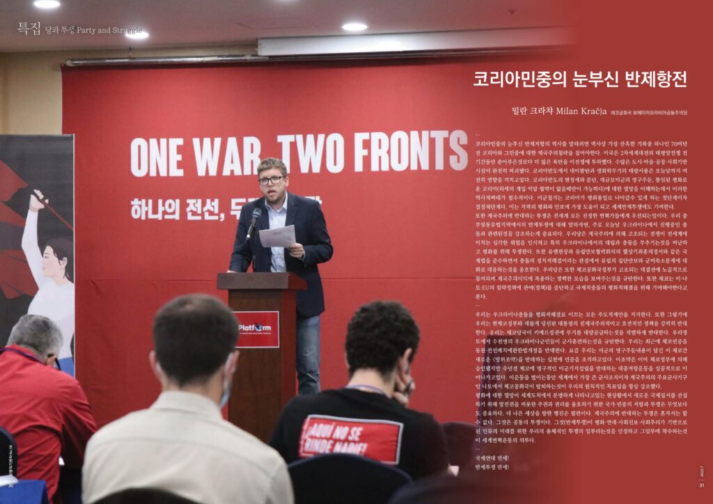 코리아민중의 눈부신 반제저항의 역사를 말하려면 역사상 가장 잔혹한 기록중 하나인 70여년전 코리아와 그민중에 대한 제국주의침략을 짚어야한다. 미국은 2차세계대전의 태평양전쟁 전기간동안 쏟아부은것보다 더 많은 폭탄을 이전쟁에 투하했다. 수많은 도시·마을·공장·사회기반시설이 완전히 파괴됐다. 코리아반도에서 네이팜탄과 생화학무기의 대량사용은 오늘날까지 여전히 영향을 끼치고있다. 코리아반도의 현정세와 분단, 대규모미군의 영구주둔, 통일된 평화로운 코리아(외세의 개입·억압·협박이 없을때만이 가능하다)에 대한 열망을 이해하는데서 이러한 역사적뼈대가 필수적이다. 미군철거는 코리아가 평화통일로 나아갈수 있게 하는 첫단계이자 결정적단계다. 이는 지역의 평화와 안보에 가장 도움이 되고 세계반제투쟁에도 기여한다.