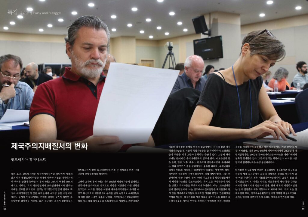 다시한번 이상황에서 우리가 주목해야할 중요한것은 제국주의자들이 세계 모든곳에서 그들의 영향력과 권력을 행사하기 위해 어떤 수단이든 계속 이용할것이라는점이다. 그들은 결코 멈추지않을것이다. 이와는 반대로 진보운동의 형성·통합·강화는 서서히 약해지거나 멈춘적이 있다. 현재 세계의 지정학적변화는 앞서 설명했듯 매우 역동적이고 빠르며 크다. 거의 모든 실제조건이 우리, 진보적운동활동가들에게 기회를 제공하고있다. 세계는 빠르게 바뀌고있으며 우리는 그흐름의 한가운데 있다.