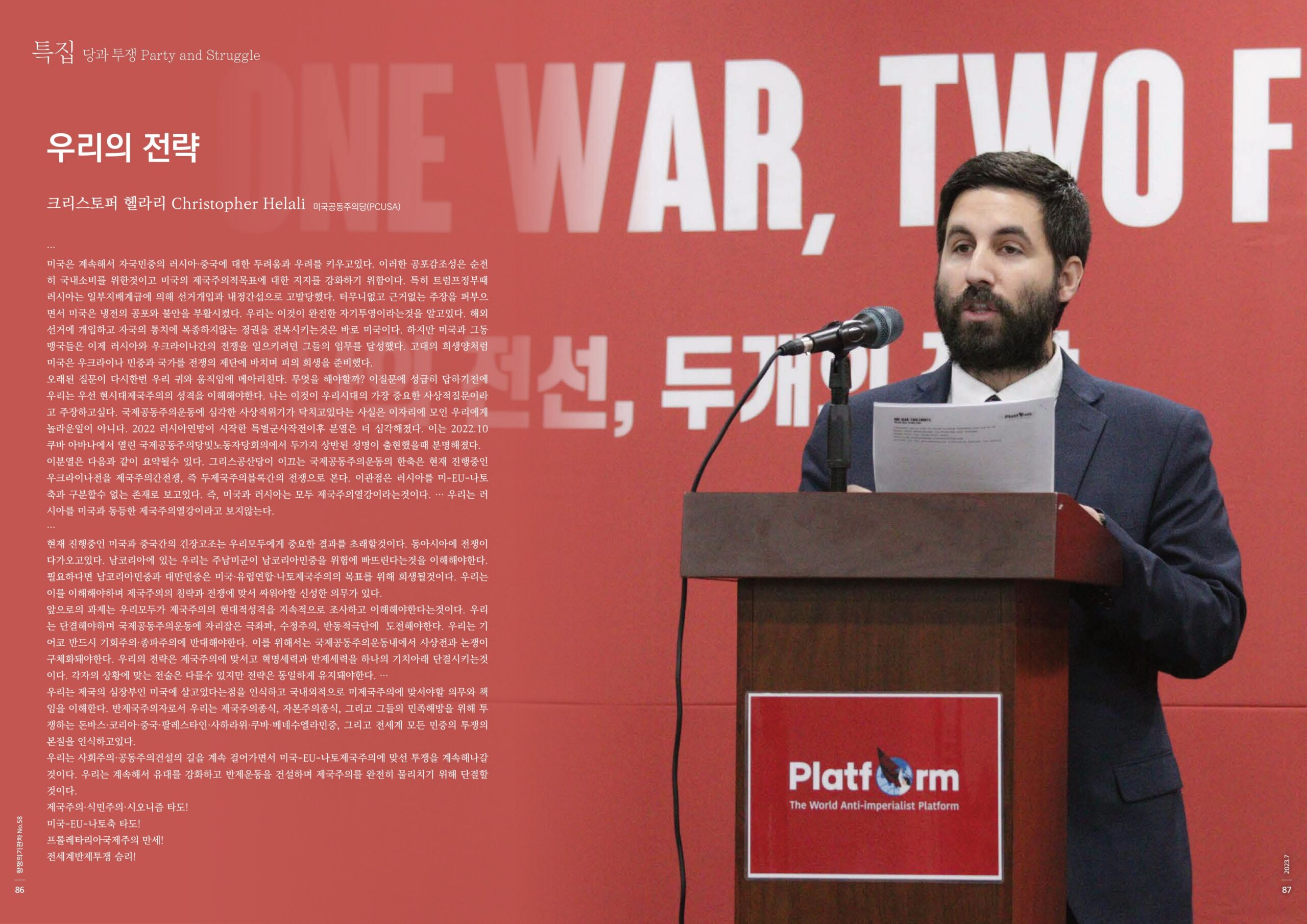 현재 진행중인 미국과 중국간의 긴장고조는 우리모두에게 중요한 결과를 초래할것이다. 동아시아에 전쟁이 다가오고있다. 남코리아에 있는 우리는 주남미군이 남코리아민중을 위험에 빠뜨린다는것을 이해해야한다. 필요하다면 남코리아민중과 대만민중은 미국·유럽연합·나토제국주의의 목표를 위해 희생될것이다. 우리는 이를 이해해야하며 제국주의의 침략과 전쟁에 맞서 싸워야할 신성한 의무가 있다.