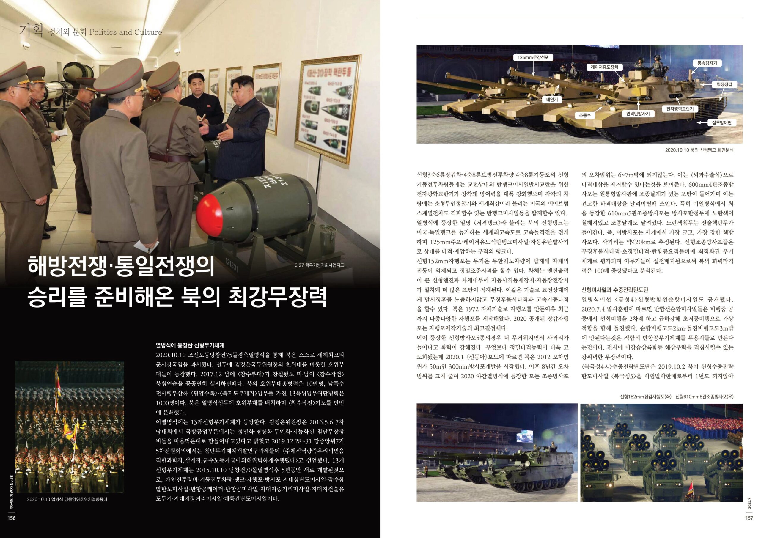 열병식에 등장한 일명 <저격탱크>라 불리는 북의 신형탱크는 미국·독일탱크를 능가하는 세계최고속도로 고속돌격전을 전개하며 125mm주포·레이저유도식반탱크미사일·자동유탄발사기로 상대를 타격·제압하는 무적의 탱크다.