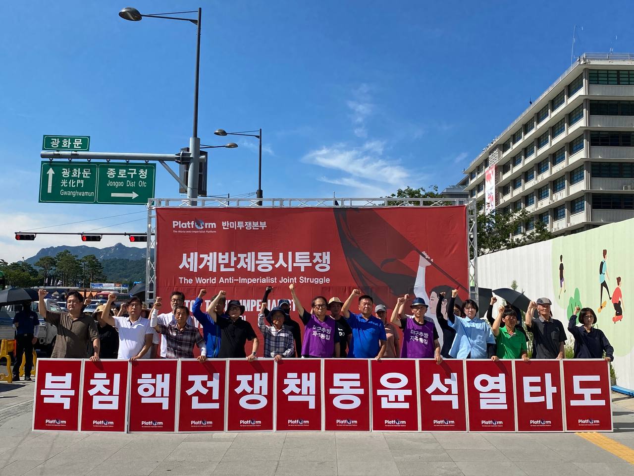 참가자들은 구호 <미제국주의전쟁책동 반대한다!>, <Stop The US Imperialist Drive to War!>, <친일친미 호전파쇼 윤석열 타도하자!>, <북침전쟁 획책하는 윤석열 타도하자!>, <동아시아핵전쟁도발 윤석열 타도하자!>, <미국·일본·한국3각군사동맹 규탄한다!>, <북침핵전쟁책동 핵전쟁화근 미군 철거하라!>를 힘차게 외쳤다.