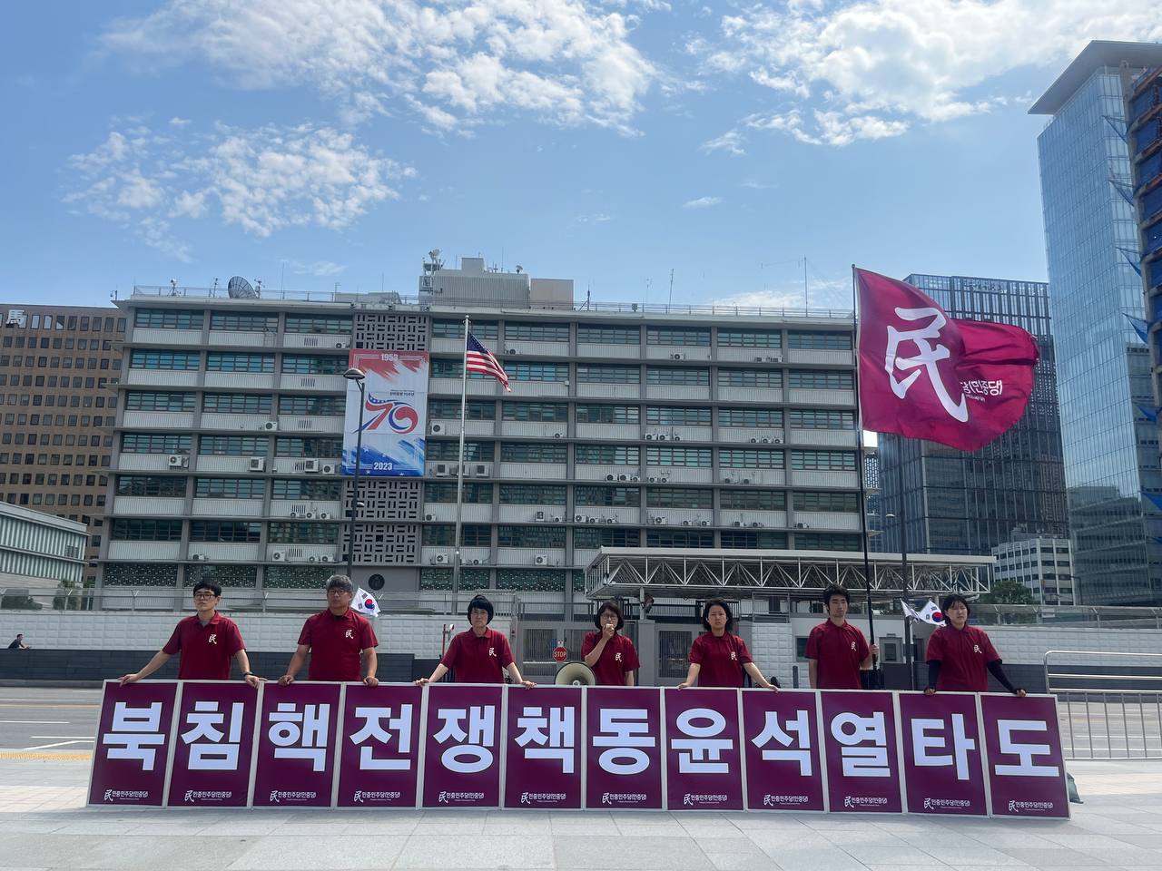15일 미·남이 UFS(을지프리덤실드)합동군사훈련의 사전위기관리연습을 시작한 가운데, 민중민주당(민중당)은 1625일째 진행되고 있는 미대앞정당연설회에서 <북침핵전쟁연습윤석열타도!> 구호를 내세우고 투쟁을 전개했다.