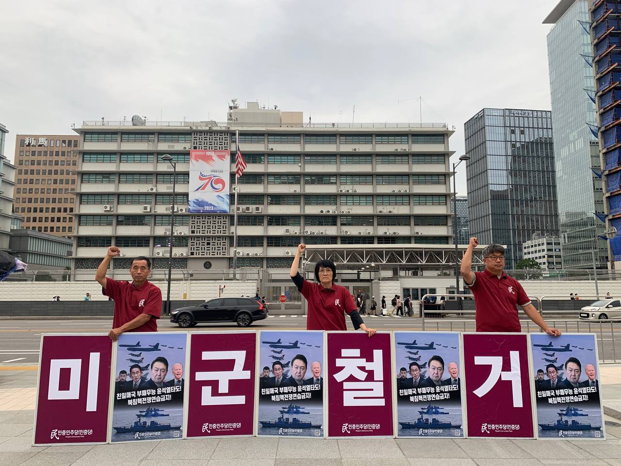 27일 민중민주당(민중당)은 미대사관앞에서 <친미호전윤석열타도! 북침핵전쟁책동중단! 핵전쟁화근 미군철거!> 구호를 들고 평화시위를 2595일째 전개했다.