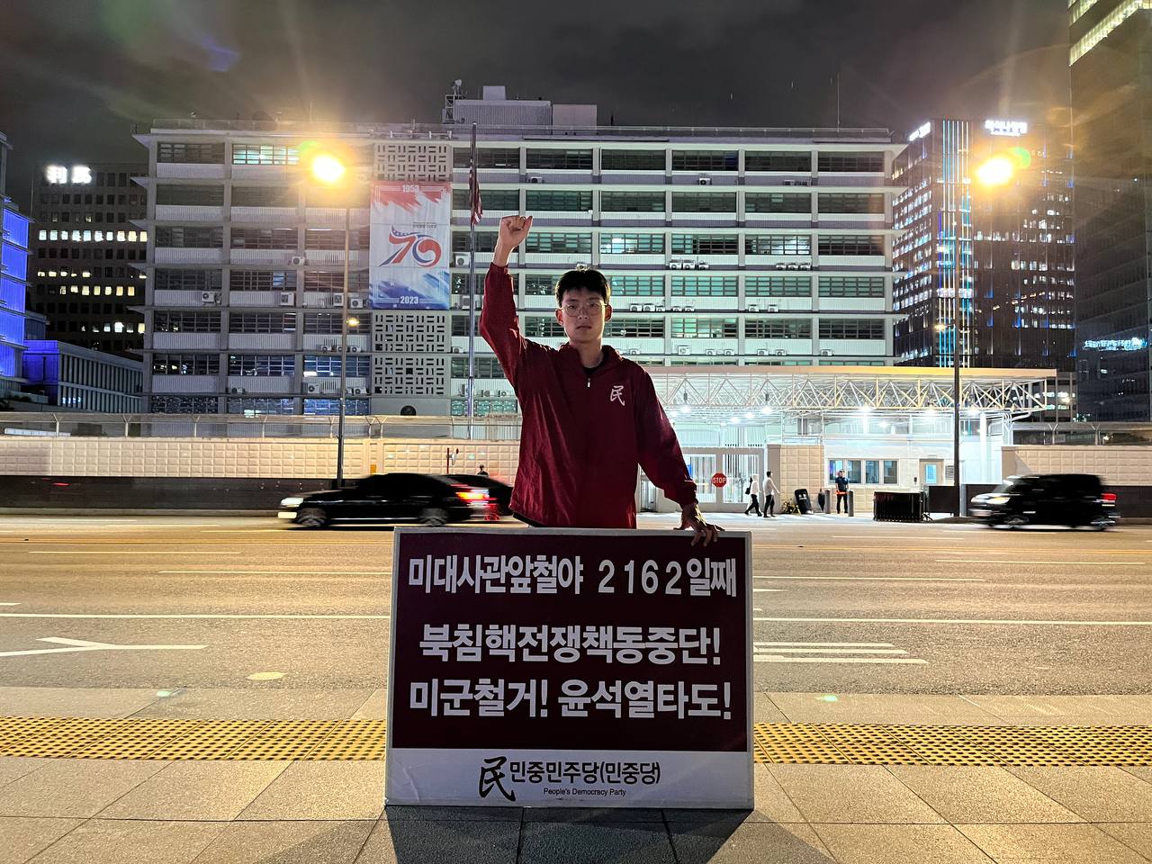 28일 민중민주당(민중당)은 미대사관앞에서 <친미호전윤석열타도! 북침핵전쟁책동중단! 핵전쟁화근 미군철거!> 구호를 들고 평화시위를 2596일째 전개했다.