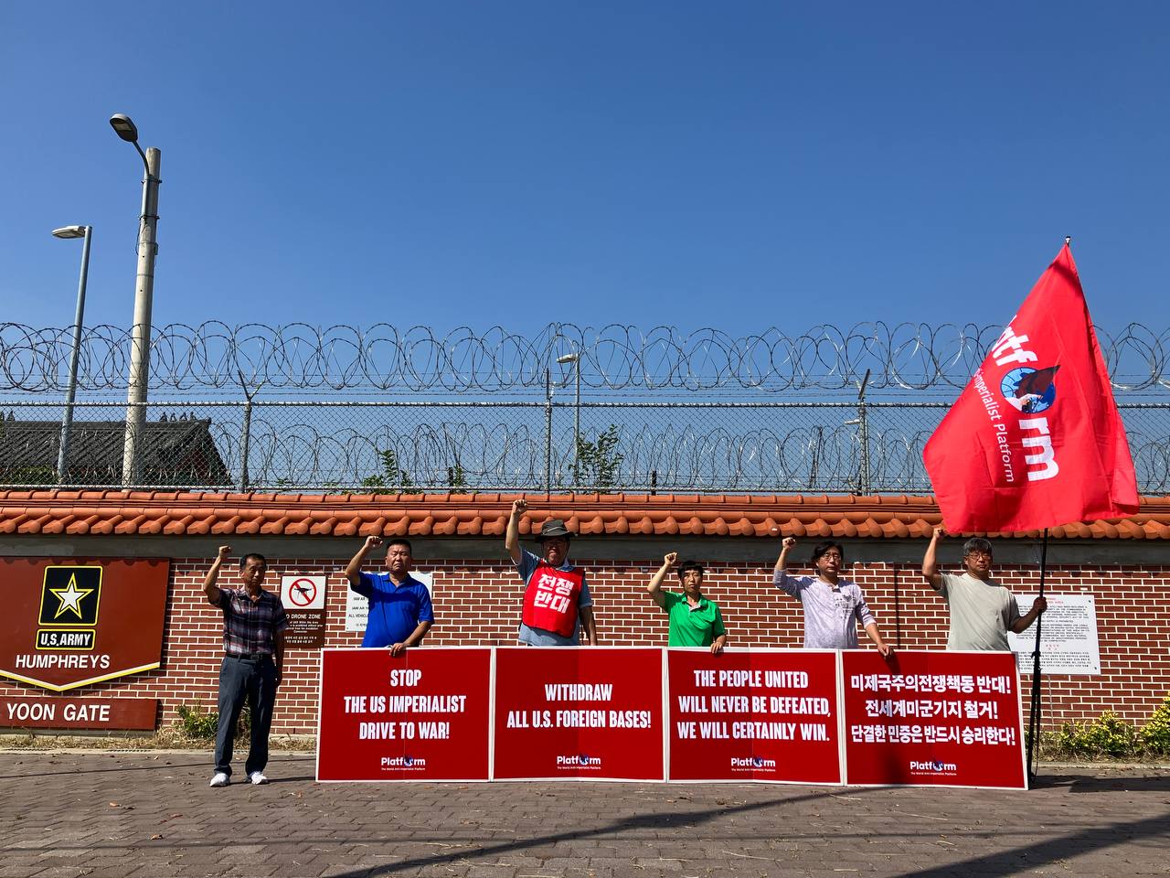 9월9일 경기도 평택 캠프험프리스미군기지앞에서 민중민주당(민중당)경기도당과 지역활동가들은 우리말과 영어로 된 구호피시 <미제국주의전쟁책동 반대! 전세계미군기지 철거! 단결한 민중은 반드시 승리한다!>를 내세우고 세계반제동시투쟁을 힘차게 진행했다.