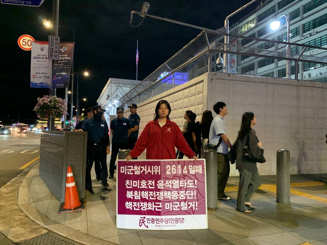 15일 민중민주당(민중당)은 미대사관앞에서 <친미호전윤석열타도! 북침핵전쟁책동중단! 핵전쟁화근 미군철거!> 구호를 들고 평화시위를 2614일째 전개했다.
