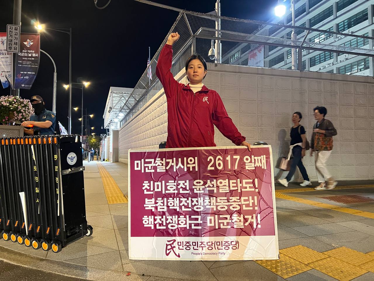 18일 민중민주당(민중당)은 미대사관앞에서 <친미호전윤석열타도! 북침핵전쟁책동중단! 핵전쟁화근 미군철거!> 구호를 들고 평화시위를 2617일째 전개했다.