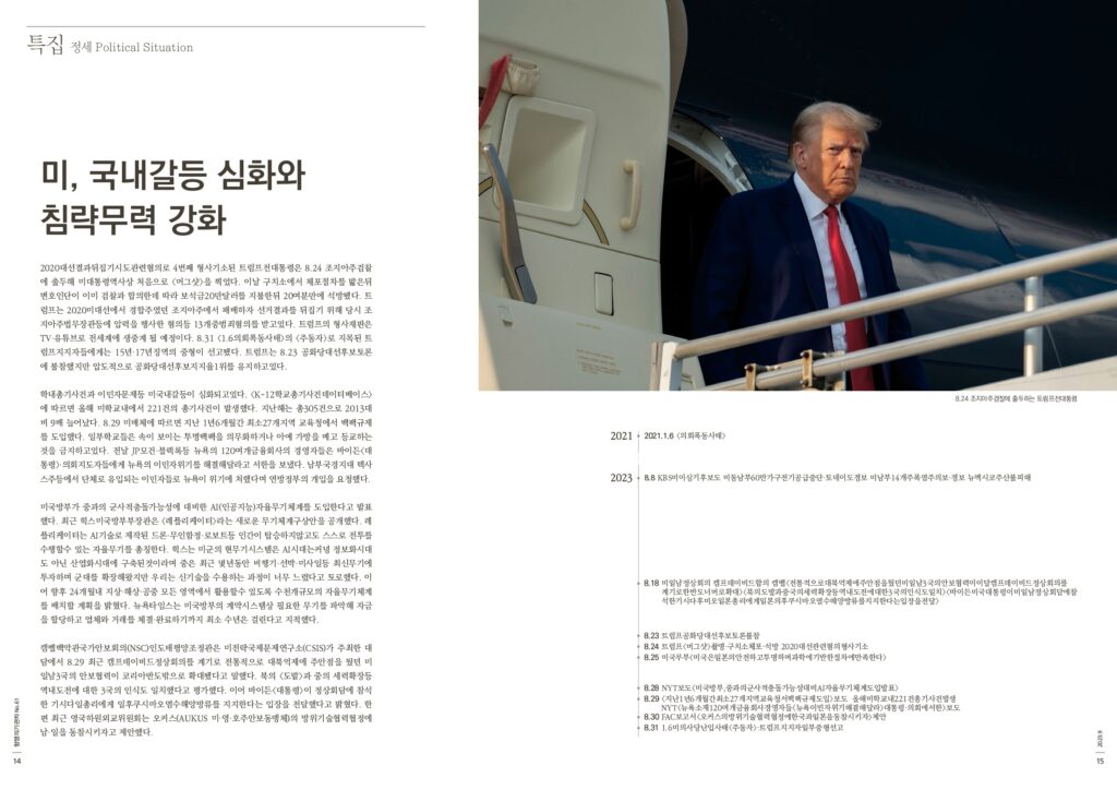 2020대선결과뒤집기시도관련혐의로 4번째 형사기소된 트럼프전대통령은 8.24 조지아주검찰에 출두해 미대통령역사상 처음으로 <머그샷>을 찍었다. 이날 구치소에서 체포절차를 밟은뒤 변호인단이 이미 검찰과 합의한데 따라 보석금20만달러를 지불한뒤 20여분만에 석방됐다. 트럼프는 2020미대선에서 경합주였던 조지아주에서 패배하자 선거결과를 뒤집기 위해 당시 조지아주법무장관등에 압력을 행사한 혐의등 13개중범죄혐의를 받고있다. 트럼프의 형사재판은 TV·유튜브로 전세계에 생중계 될 예정이다. 8.31 <1.6의회폭동사태>의 <주동자>로 지목된 트럼프지지자들에게는 15년·17년징역의 중형이 선고됐다. 트럼프는 8.23 공화당대선후보토론에 불참했지만 압도적으로 공화당대선후보지지율1위를 유지하고있다.