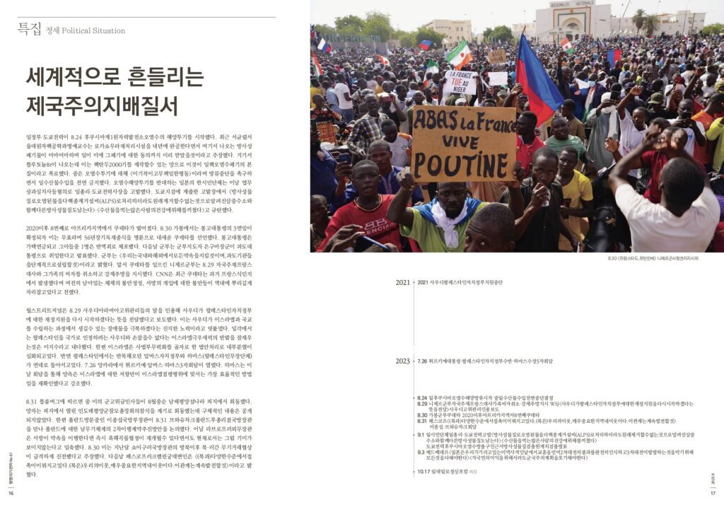 2020이후 8번째로 아프리카지역에서 쿠데타가 벌어졌다. 8.30 가봉에서는 봉고대통령의 3연임이 확정되자 이는 무효라며 56년장기독재종식을 명분으로 내세운 쿠데타를 선언했다. 봉고대통령은 가택연금되고 그아들중 1명은 반역죄로 체포됐다. 다음날 군부는 군부지도자 은구마장군이 과도대통령으로 취임한다고 발표했다. 군부는 <우리는국내와해외에서모든약속을지킬것이며,과도기관들을단계적으로설립할것>이라고 밝혔다. 앞서 쿠데타를 일으킨 니제르군부는 8.29 자국주재프랑스대사와 그가족의 비자를 취소하고 강제추방을 지시했다. CNN은 최근 쿠데타는 과거 프랑스식민지에서 발생했다며 여전히 남아있는 체제의 불안정성, 서방의 개입에 대한 불만등이 역내에 뿌리깊게 자리잡고있다고 전했다.