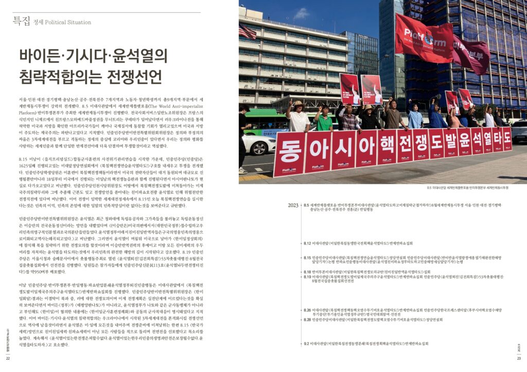 서울·인천·대전·경기평택·충남논산·공주·전북전주 7개지역과 노동자·청년학생까지 총9개지역·부문에서 세계반제동시투쟁이 강력히 전개됐다. 8.5 미대사관앞에서 세계반제플랫포옴(The World Anti-imperialist Platform)·반미투쟁본부가 주최한 세계반제동시투쟁이 진행됐다. 전국사회서비스일반노조위원장은 프랑스의 식민지인 니제르에서 친프랑스모하메드바줌정권을 무너트리는 쿠데타가 일어났다면서 러우크라이나전을 통해 허약한 미국과 서방을 확인한 아프리카국가들이 깨어나 국제질서에 동참할 기회가 열리고있으며 미국과 서방이 주도하는 제국주의는 파탄나고있다고 지적했다. 민중민주당반미반전특별위원회위원장은 정의와 부정의의 싸움은 3차세계대전을 부르고 격동하는 정세의 중심에 코리아와 우리민중이 있다면서 우리는 정의와 평화를 사랑하는 세계민중과 함께 단일한 반제전선아래 더욱 단결하여 투쟁할것이라고 역설했다.