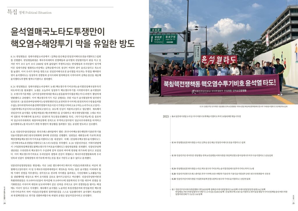 8.24 반일행동은 일대사관앞소녀상에서 논평<핵오염수투기비호하는윤석열친일매국정부즉각타도하자!>를 발표했다. 논평은 오늘부터 일정부가 핵오염수투기를 시작한다면서 윤석열정부는 오염수투기문제를 <굳이찬성과반대의문제로논점을좁혀서다룰문제는아니>라면서 황당하게 망발했다고 규탄했다. 이어 핵오염수투기가 지금 감행되는 주된 이유가 윤석열정부에 있다면서 일언론의 <윤정권과여당내에서는당면한현안인도쿄전력후쿠시마제1원전의처리수방출을피할수없는것이라면차라리총선에악영향이적은이른시기에실시하라고요구하는소리가나오고있다>·<일본쪽에도비공식적으로전달되고있다>는 보도에 민심이 격분하고있다고 힐난했다. 계속해서 친일친미의 윤석열은 일제강제동원<제3자변제안>을 공식화하고 매국적한일합의를 그대로 따르며 일본의 역사왜곡에 동조하고 일정부의 독도영유권궤변을 묵인, <적기지공격능력>을 옹호하며 일군국주의세력의 재침야욕실현에 전적으로 부역하고있다면서 일군국주의세력을 타격하고 윤석열매국노를 타도하기 위한 투쟁만이 현상황을 돌파할수 있는 유일한 방도라고 강조했다.
