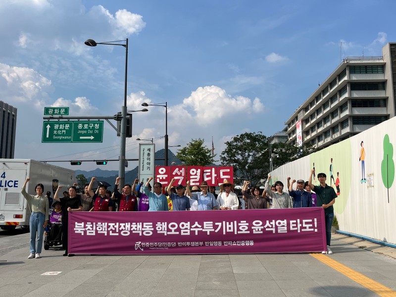 8.26 민중민주당(민중당)은 한국프레스센터앞에서 열린 <후쿠시마핵오염수해양투기중단!투기용인윤석열정부규탄!>범국민대회에 참여해 선전전을 진행했다. 당원들은 대회장소에 가로막<북침핵전쟁책동핵오염수투기비호윤석열타도!>를 내걸었다. 더해 <친일매국핵오염수윤석열타도!>·