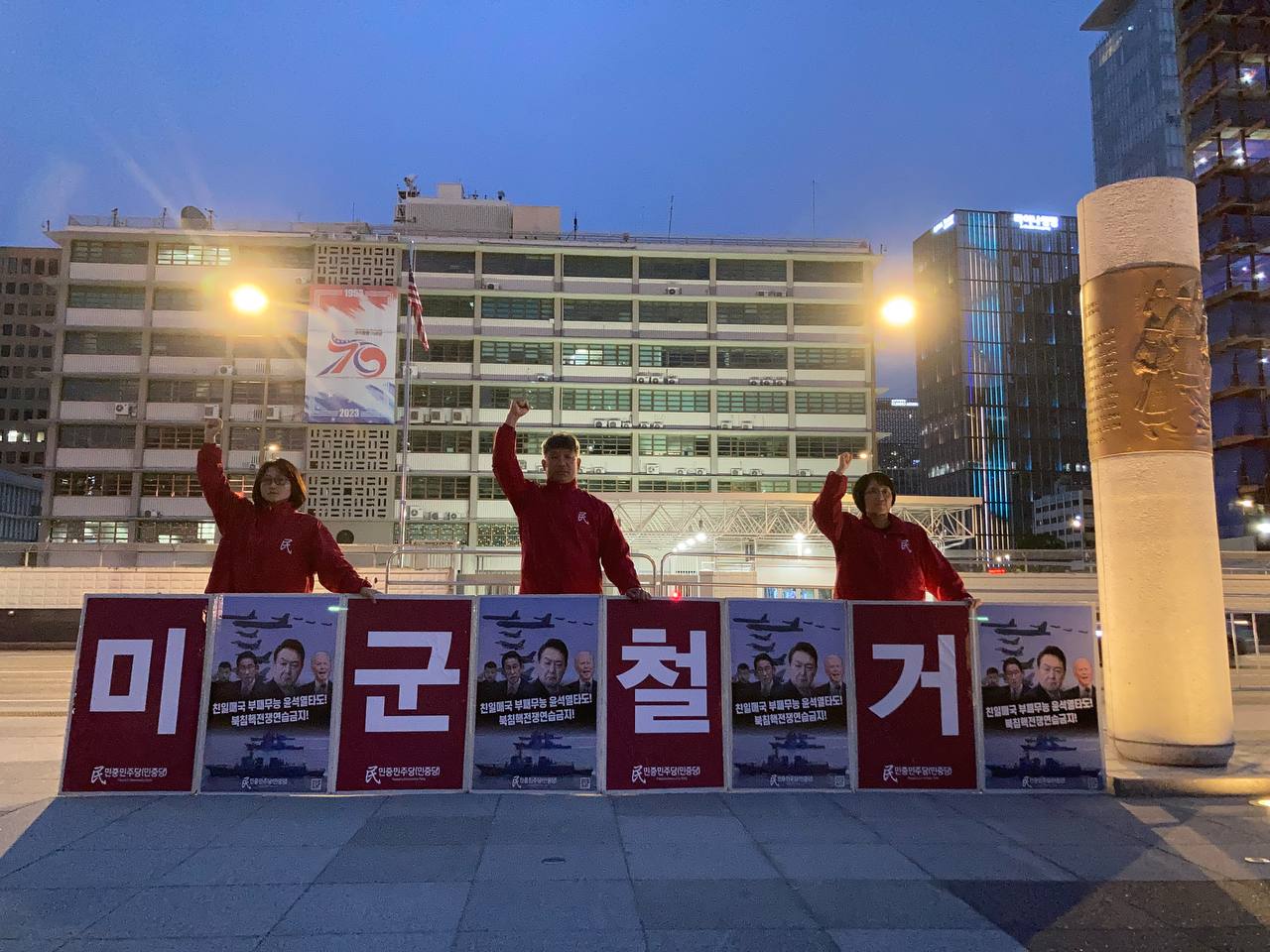 미대사관정문 맞은편에서는 우리말과 영어로 된 구호 <북침핵전쟁책동중단! 미군철거! 윤석열타도!>를 들고 <광화문미대사관앞철야시위>를 진행했다.