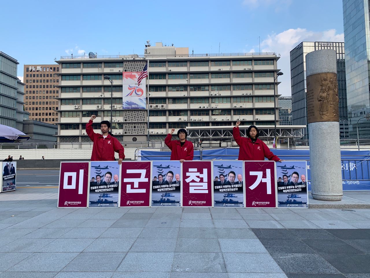 미대사관정문 맞은편에서는 우리말과 영어로 된 구호 <북침핵전쟁책동중단! 미군철거! 윤석열타도!>를 들고 <광화문미대사관앞철야시위>를 진행했다.