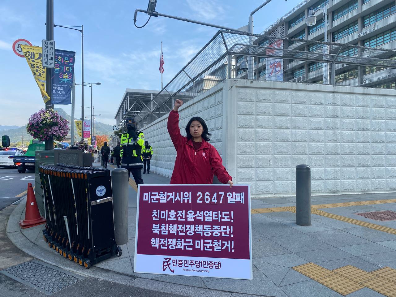 18일 민중민주당(민중당)은 미대사관앞에서 <친미호전윤석열타도! 북침핵전쟁책동중단! 핵전쟁화근 미군철거!> 구호를 들고 평화시위를 2647일째 전개했다.