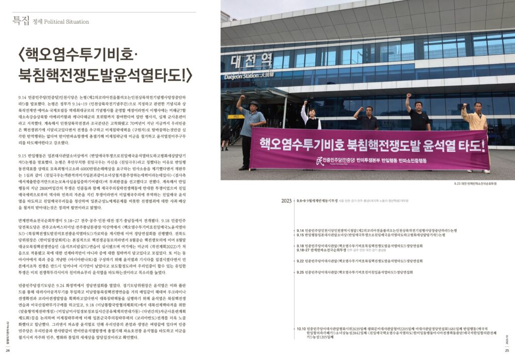 반제반파쇼전국순회투쟁이 9.18~27 전주·공주·인천·대전·경기·충남등에서 전개됐다. 9.18 민중민주당전북도당은 전주고속버스터미널·전주풍남문광장·익산역에서 <핵오염수투기비호친일매국노윤석열타도!>·<북침핵전쟁도발친미호전광윤석열타도!>가로막을 게시한데 이어 정당연설회를 진행했다. 전북도당위원장은 <한미일정상회의>는 본질적으로 핵전쟁공동모의라면서 8월중순 핵전쟁모의에 이어 8월말 대규모북침핵전쟁연습인 <을지프리덤실드>연습이 실시됐으며 여기에는 미군의 <작전계획2022>가 처음으로 적용됐고 북에 대한 선제타격만이 아니라 중에 대한 침략까지 담고있다고 꼬집었다. 또 미는 동아시아에서 북과 중을 겨냥한 <아시아판나토>를 구성하기 위해 윤석열과 기시다를 집결시켰다면서 언론에서조차 전쟁은 반드시 일어나며 시기만이 남았다고 보도할정도라며 우리민중이 할수 있는 유일한 투쟁은 미의 전쟁꼭두각시이자 친미파쇼무리 윤석열을 타도하는것이라고 목소리를 높였다.