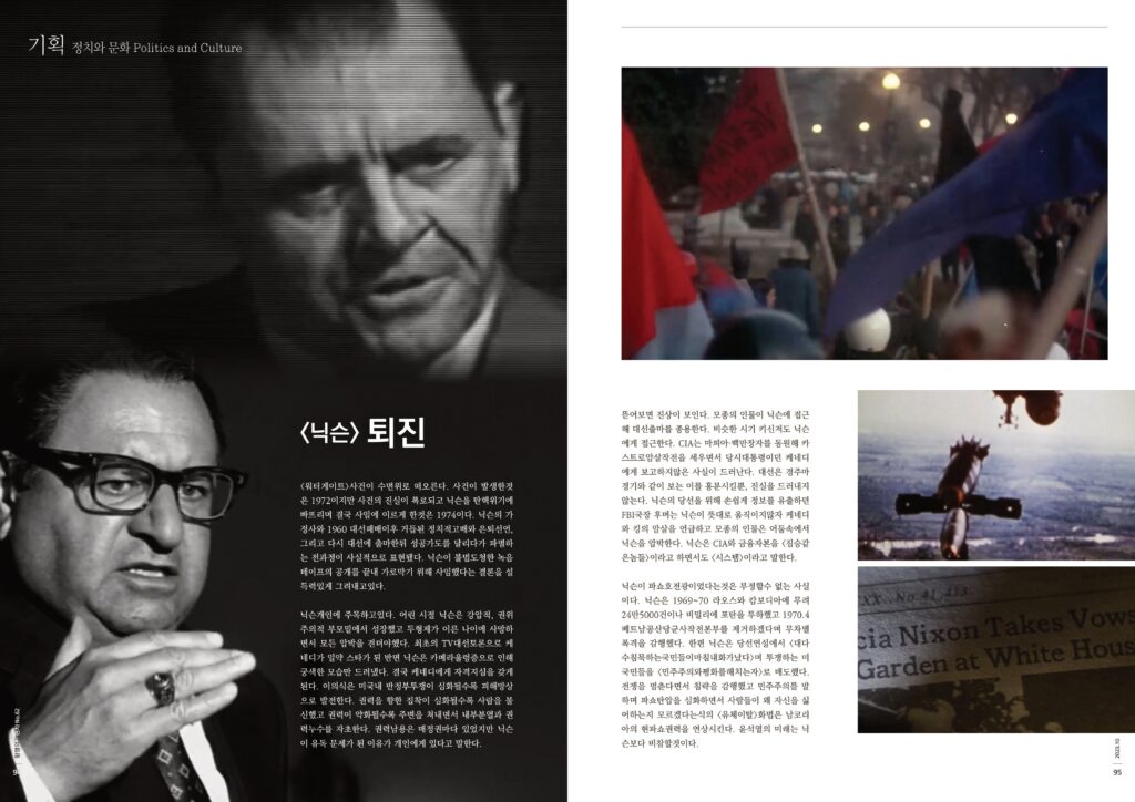 <워터게이트>사건이 수면위로 떠오른다. 사건이 발생한것은 1972이지만 사건의 진실이 폭로되고 닉슨을 탄핵위기에 빠뜨리며 결국 사임에 이르게 한것은 1974이다. 닉슨의 가정사와 1960 대선패배이후 거듭된 정치적고배와 은퇴선언, 그리고 다시 대선에 출마한뒤 성공가도를 달리다가 파멸하는 전과정이 사실적으로 표현됐다. 닉슨이 불법도청한 녹음테이프의 공개를 끝내 가로막기 위해 사임했다는 결론을 설득력있게 그려내고있다.