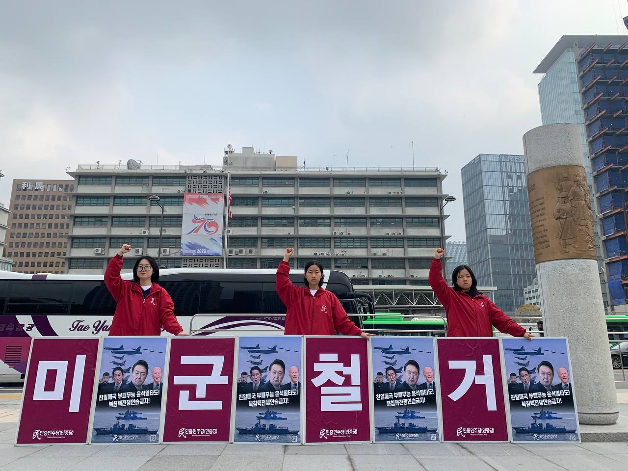 미대사관정문 맞은편에서는 우리말과 영어로 된 구호 <북침핵전쟁책동중단! 미군철거! 윤석열타도!>를 들고 <광화문미대사관앞철야시위>를 진행했다.
