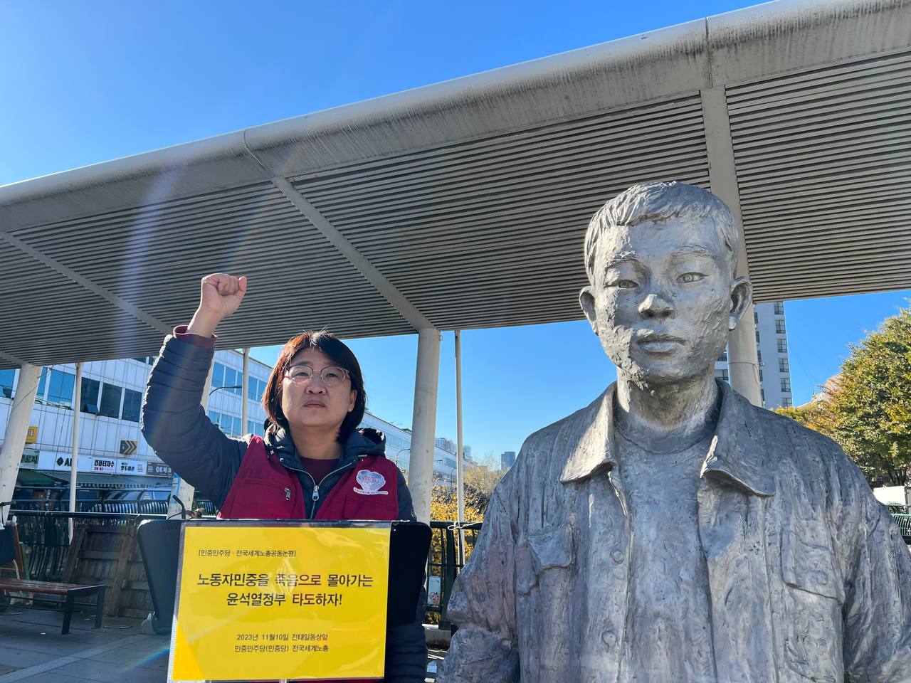 3. 윤석열이 이땅위에서 전쟁을 하겠다며 미쳐날뛰고 있다. 윤석열호전광은 2022년 우크라이나전과 2023년 팔레스타인전, 중동전에 이어 2024년 <한국전>과 대만전을 일으키려는 미국의 침략전쟁일정에 동조하며 미제국주의의 전쟁꼭두각시를 자처하고 있다. 윤석열은 미국이 조작하는 북침전쟁동맹, <아시아판나토>에 적극적으로 가담하는 한편, 하루가 멀다하고 북침핵전쟁연습을 전개하며 이땅위에 3차세계대전의 폭풍을 불러오고 있다. 밖으로는 전쟁도발과 남북대결에 광분하고 안으로는 파쇼통치와 민생파탄에 발광하는 윤석열을 타도하지 않으면 우리노동자·민중은 전쟁의 총알받이로, 파쇼탄압의 희생자로, 2중3중의 착취대상으로 완전히 전락하게 된다. 윤석열을 우선 타도하고 반민중착취세력을 분쇄하며 전태일열사가 그토록 염원하던 노동자·민중을 위한 사회, 환수복지와 민중민주의 참세상을 앞당기기 위해 모두가 민중항쟁에 총궐기해야 할 때다.