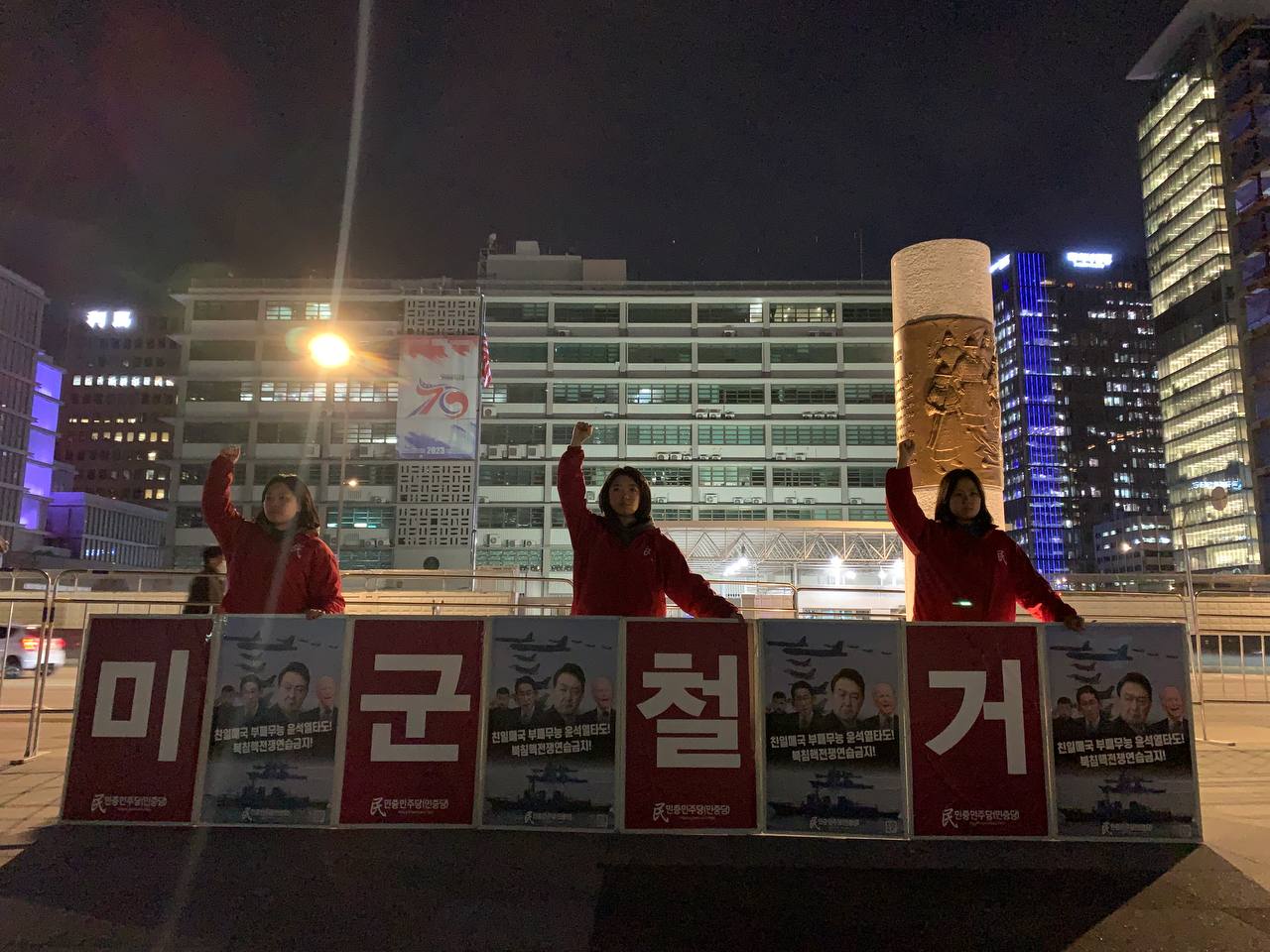 미대사관정문 맞은편에서는 우리말과 영어로 된 구호 <북침핵전쟁책동중단! 미군철거! 윤석열타도!>를 들고 <광화문미대사관앞철야시위>를 진행했다.