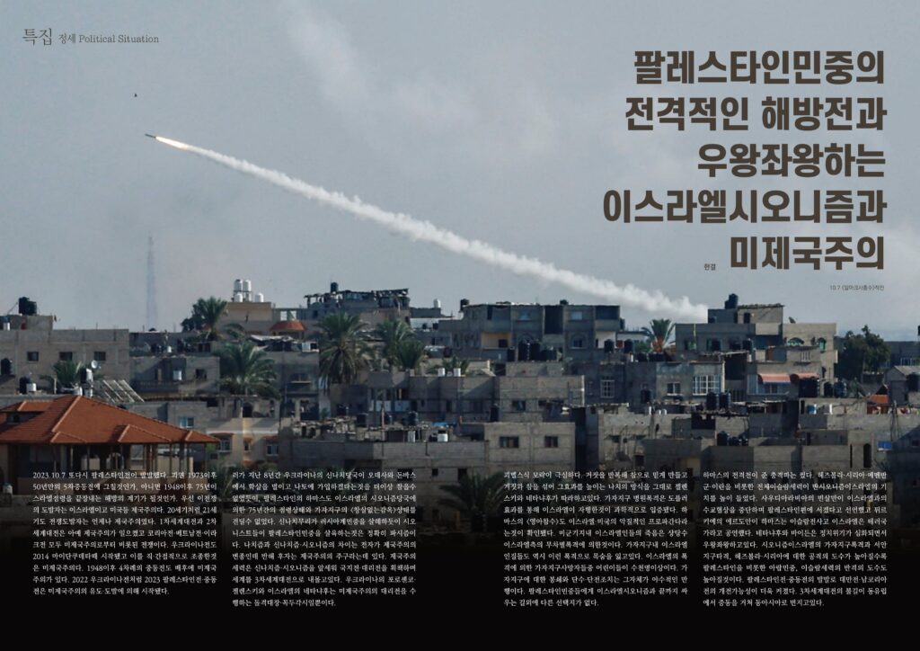 2023.10.7 또다시 팔레스타인전이 발발했다. 과연 1973이후 50년만의 5차중동전에 그칠것인가, 아니면 1948이후 75년이스라엘점령을 끝장내는 해방의 계기가 될것인가. 우선 이전쟁의 도발자는 이스라엘이고 미국등 제국주의다. 20세기처럼 21세기도 전쟁도발자는 언제나 제국주의였다. 1차세계대전과 2차세계대전은 아예 제국주의가 일으켰고 코리아전·베트남전·이라크전 모두 미제국주의로부터 비롯된 전쟁이다. 우크라이나전도 2014 마이단쿠데타때 시작됐고 이를 직·간접적으로 조종한것은 미제국주의다. 1948이후 4차례의 중동전도 배후에 미제국주의가 있다. 2022 우크라이나전처럼 2023 팔레스타인전·중동전은 미제국주의의 유도·도발에 의해 시작됐다.