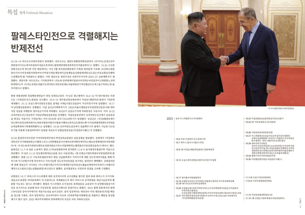 10.26 블링컨미국무장관·가미카와일외무대신·박진남외교장관은 공동성명을 발표했다. 성명에서 <미일한은러북간무기거래및관련군사협력그리고그러한행동들이국제안보와비확산에미치는해로운영향에단호히반대한다>며 <우리는북러가관련유엔안보리결의를준수하고이를위반하는행위를즉각중단할것을촉구>한다고 했다. 블링컨은 11.7~8 일본 도쿄에서 열린 G7외교장관회의에 참석한뒤 11.8~9 윤석열정부출범이후 처음으로 방남했다. 미·남은 11.13 안보협의회의(SCM)를 갖고 다음날에는 <한·유엔군사령부회원국국방장관회의>를 진행했다. 한편 10.27 미뉴욕유엔본부에서 열린 긴급총회에서 가자지구에 대한 인도주의적지원을 위해 하마스와 이스라엘사이에 즉각적이고 지속가능한 인도주의적휴전을 촉구하는 결의안이 채택됐다. 유엔결의안에 대해 영일간지 가디언은 <이스라엘이최근가자지구에대한지상작전강도를높임에따라미국과이스라엘이국제적으로고립되고있는상황을반영>하고있다고 평했다. 윤석열정부는 미정부의 입장을 고려해 기권했다.