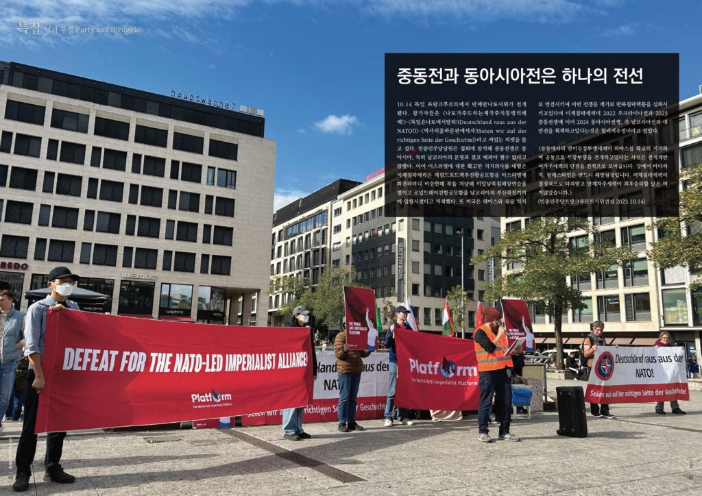 10.14 독일 프랑크푸르트에서 반제반나토시위가 전개됐다. 참가자들은 <나토가주도하는제국주의동맹의패배!>·<독일은나토에서탈퇴!(Deutschland raus aus der NATO!)>·<역사의올바른편에서자!(Seien wir auf der richtigen Seite der Geschichte)>라고 써있는 피켓을 들고 섰다. 민중민주당당원은 집회에 참석해 중동전쟁은 동아시아, 특히 남코리아의 운명과 결코 떼려야 뗄수 없다고 말했다. 이어 이스라엘에 대한 확고한 지지의사를 내뱉은 미제침략세력은 제럴드포드핵추진항공모함을 이스라엘에 파견하더니 비슷한때 북을 겨냥해 미일남북침해상연습을 벌이고 로널드레이건항공모함을 남코리아의 부산작전기지에 입항시켰다고 지적했다. 또 미국은 하마스와 북을 억지로 연결시키며 이번 전쟁을 계기로 반북침략책동을 심화시키고있다며 미제침략세력이 2022 우크라이나전과 2023 중동전쟁에 이어 2024 동아시아전쟁, 즉 남코리아전과 대만전을 획책하고있다는것은 합리적추정이라고 짚었다.