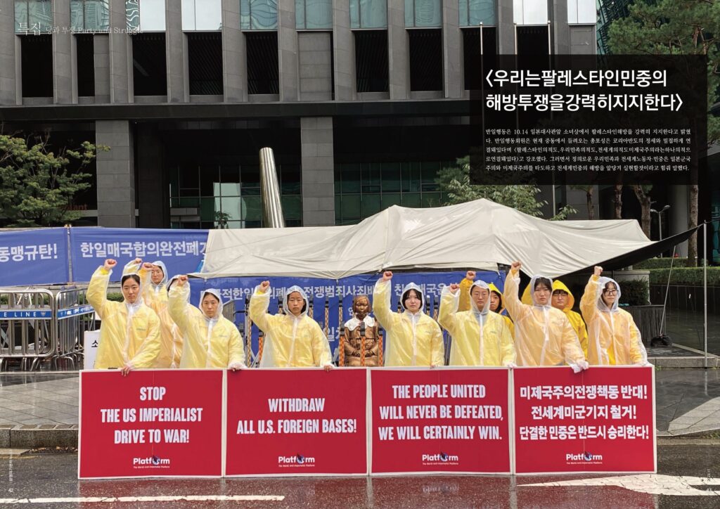 항쟁의기관차 〈2023.11 항쟁의기관차〉 〈우리는팔레스타인민중의해방투쟁을강력히지지한다〉 2023년 11월 17일 FacebookTwitter 반일행동은 10.14 일본대사관앞 소녀상에서 팔레스타인해방을 강력히 지지한다고 밝혔다. 반일행동회원은 현재 중동에서 들려오는 총포성은 코리아반도의 정세와 밀접하게 연결돼있다며 <팔레스타인의적도,우리민족의적도,전세계의적도미제국주의라는하나의적으로연결돼있다>고 강조했다. 그러면서 정의로운 우리민족과 전세계노동자·민중은 일본군국주의와 미제국주의를 타도하고 전세계민중의 해방을 앞당겨 실현할것이라고 힘줘 말했다.