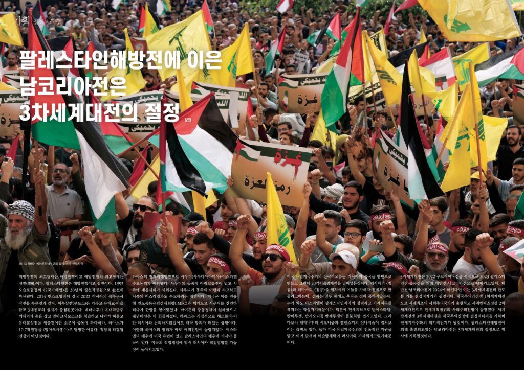 3차세계대전은 2022 우크라이나전을 시작으로 2023 팔레스타인전·중동전을 거쳐 대만전·남코리아전으로 나아가고있다. 대만전·남코리아전이 2024에 터진다면 이는 3차세계대전의 판도를 가를 결정적계기가 될것이다. 제국주의간전쟁 1차세계대전으로 세계최초의 사회주의국가가 출현하고 세계반파쇼전쟁 2차세계대전으로 전세계적범위의 사회주의진영이 등장했다. 세계반제전쟁 3차세계대전은 제국주의진영에 결정적타격을 가하며 전세계자주화의 획기적전기가 될것이다. 팔레스타인해방전에 의해 촉진되고있는 남코리아전은 3차세계대전의 절정으로 역사에 기록될것이다.