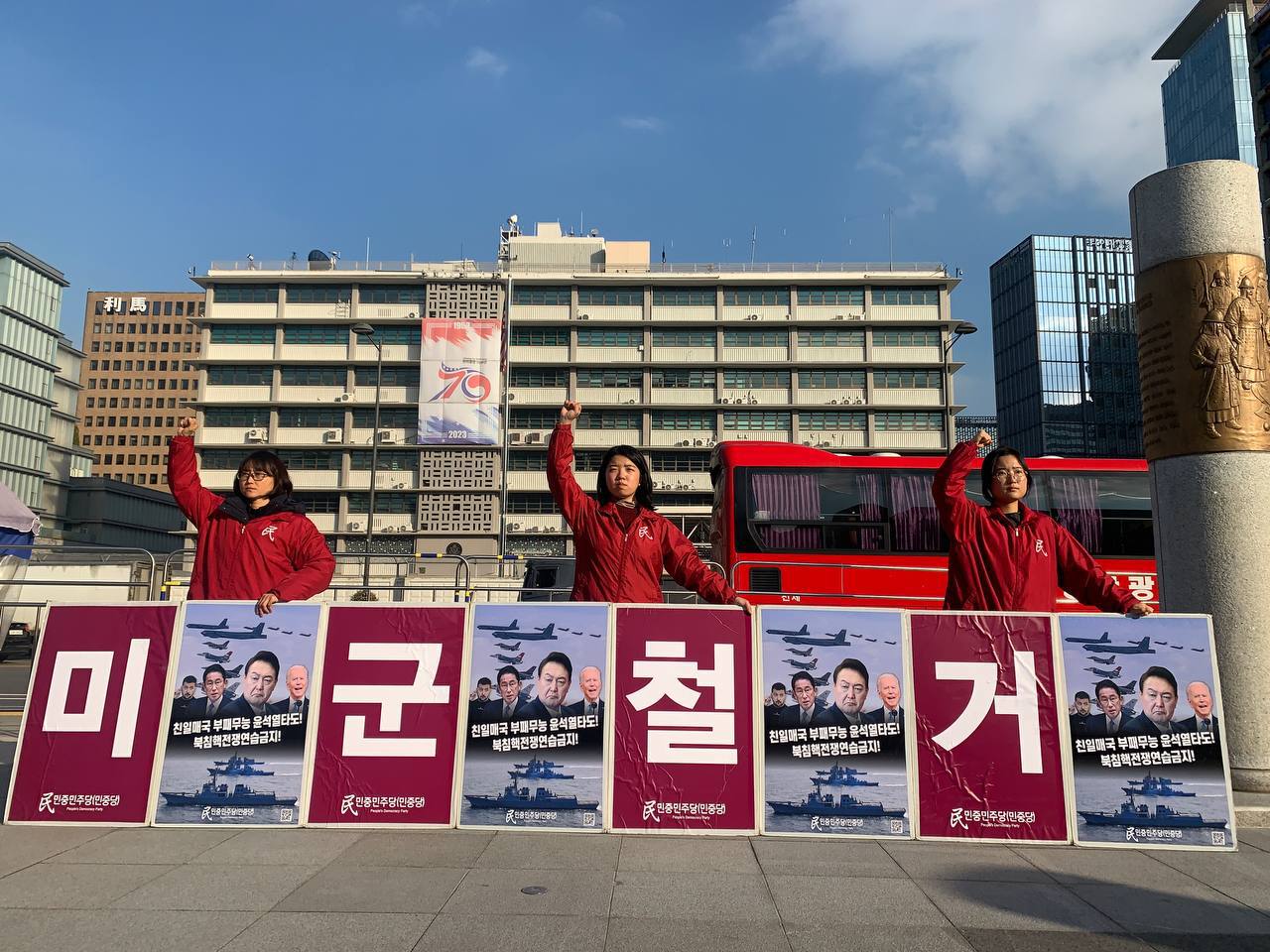23일 민중민주당(민중당)은 미대사관앞에서 <친미호전윤석열타도! 북침핵전쟁책동중단! 핵전쟁화근 미군철거!> 구호를 들고 평화시위를 2683일째 전개했다.