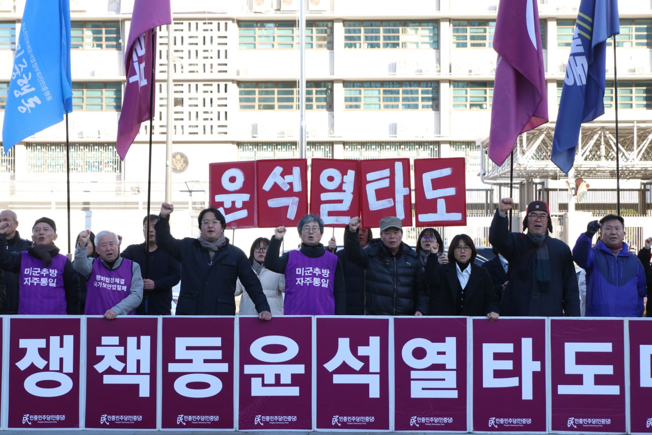 25일 민중민주당(민중당)·반미투쟁본부(반미투본)·반일행동·파쇼탄압분쇄윤석열정부퇴진민중행동(반파쇼민중행동)은 미대사관앞에서 <핵전쟁모의 핵전쟁연습 윤석열친미주구정부타도!> 집회·행진을 진행했다.