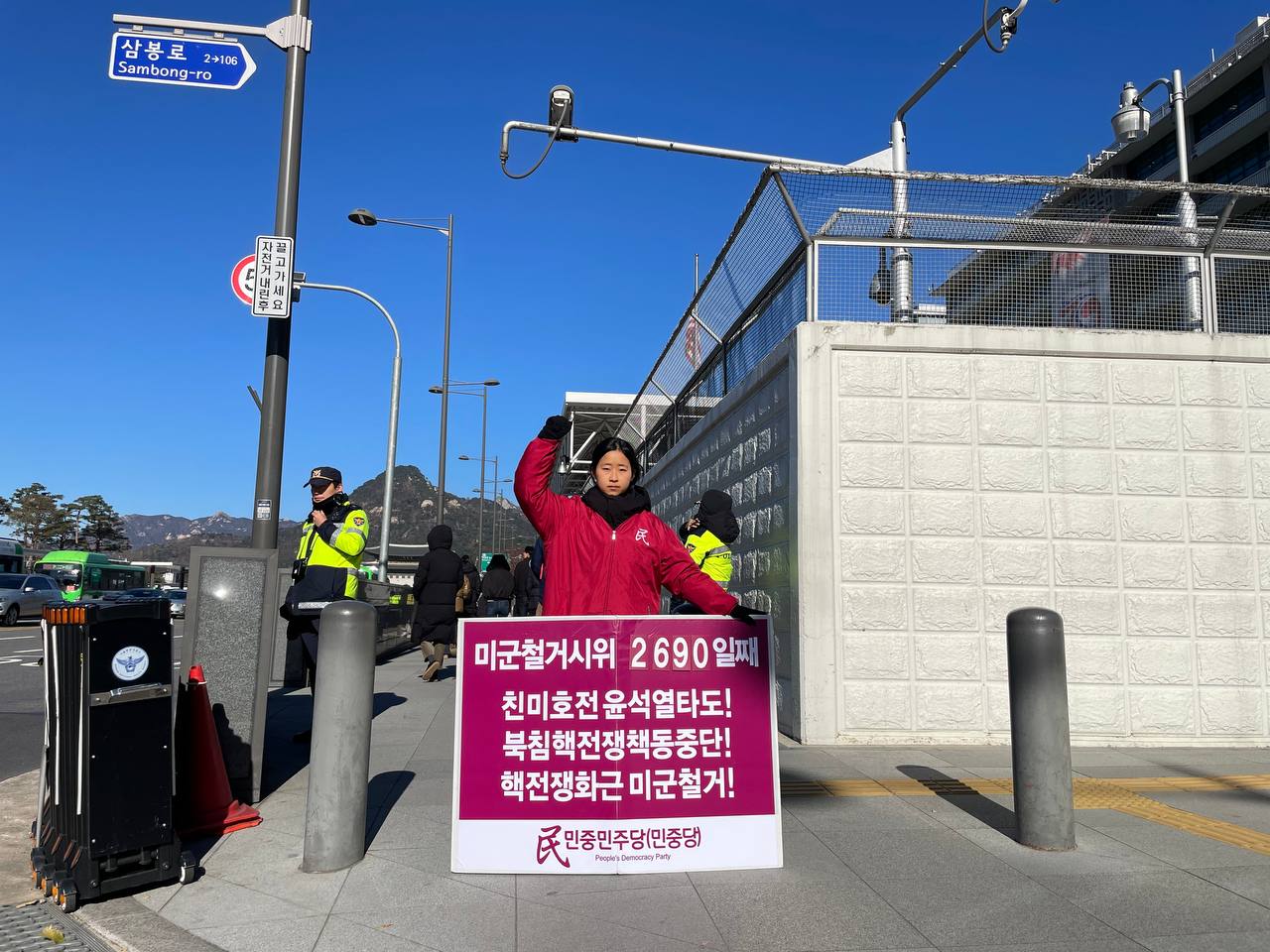 30일 민중민주당(민중당)은 미대사관앞에서 <친미호전윤석열타도! 북침핵전쟁책동중단! 핵전쟁화근 미군철거!> 구호를 들고 평화시위를 2690일째 전개했다.
