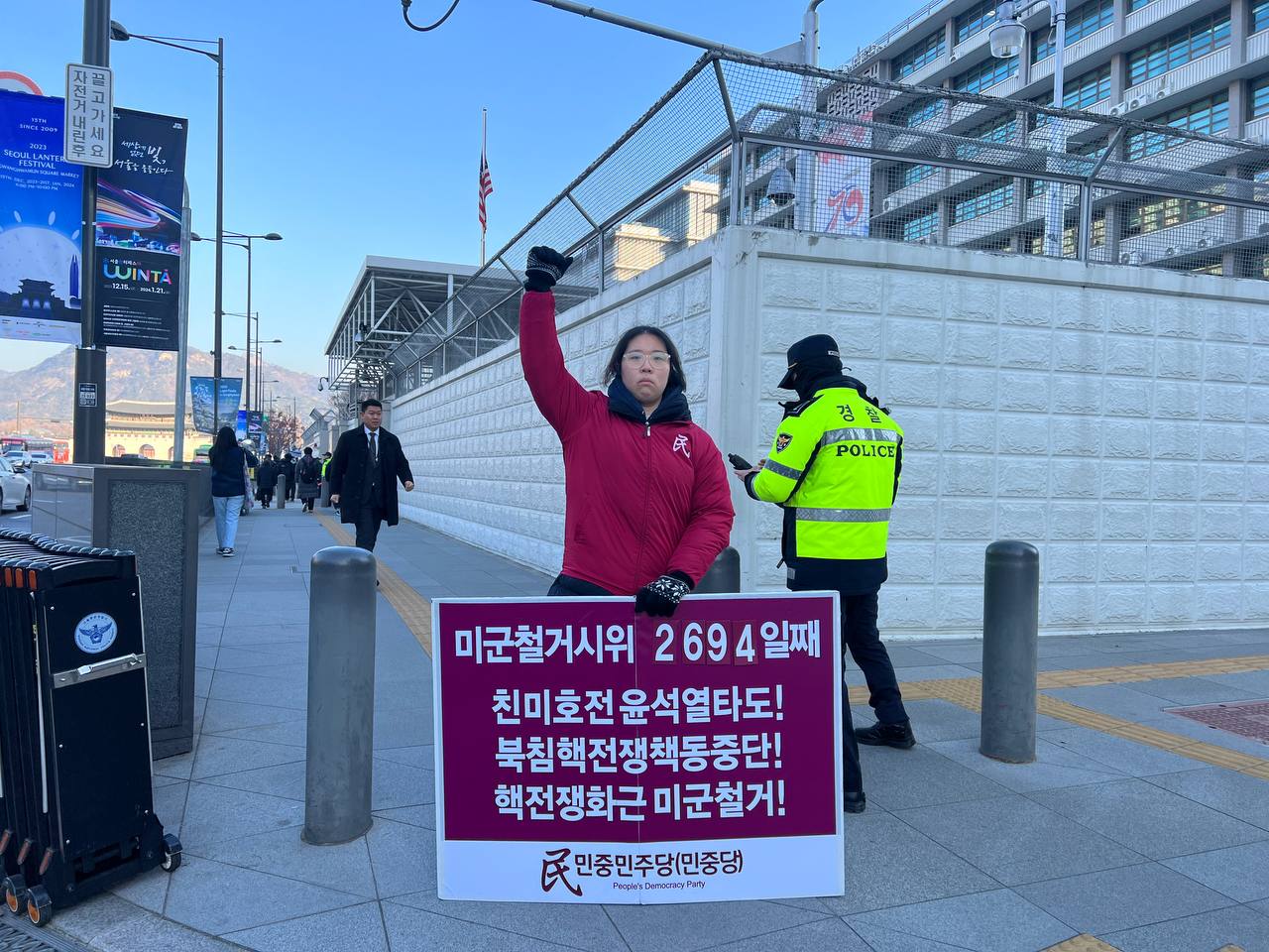 4일 민중민주당(민중당)은 미대사관앞에서 <친미호전윤석열타도! 북침핵전쟁책동중단! 핵전쟁화근 미군철거!> 구호를 들고 평화시위를 2694일째 전개했다.