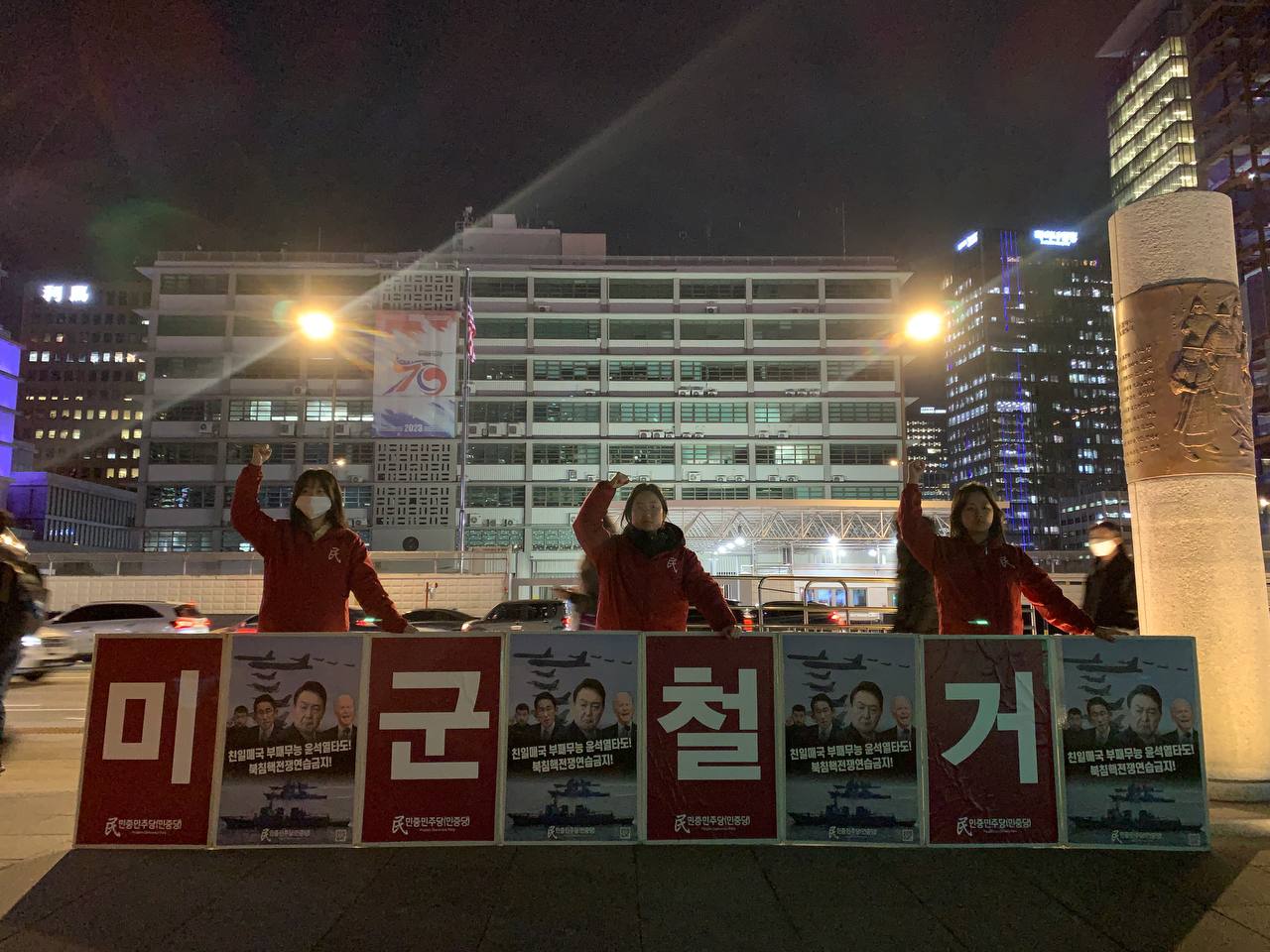 미대사관정문 맞은편에서는 우리말과 영어로 된 구호 <북침핵전쟁책동중단! 미군철거! 윤석열타도!>를 들고 <광화문미대사관앞철야시위>를 진행했다.