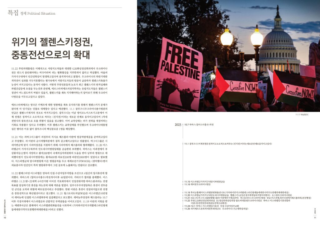 11.22 푸틴러대통령은 이례적으로 서방지도자들과 대면한 G20화상정상회의에서 우크라이나전은 반드시 중단돼야하는 비극이라며 러는 평화협상을 거부한적이 없다고 역설했다. 아울러 가자지구내에서 민간인학살이 발생하고있다며 충격적이라고 밝혔다. 우크라이나의 하반기대반격작전이 성과를 거두지못했다는 평가속에서 서방지도자들의 방문이 급증하자 젤렌스키축출가능성이 커지고있다는 분석이 나왔다. 서방의 주류언론들의 논조가 최근 젤렌스키의 반격실패와 파벌간갈등에 초점을 두는것과 관련해, 에브스타피예프러정치학자는 유럽지도자들은 젤렌스키정권이 어느정도까지 버틸수 있을지, 젤렌스키를 계속 지지해야하는지 알아보기 위해 우크라이나방문을 서두르고있다고 짚었다.