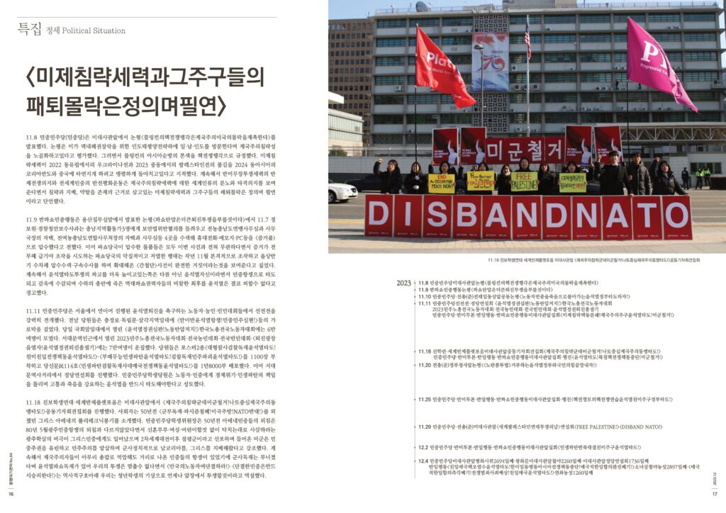 11.8 민중민주당(민중당)은 미대사관앞에서 논평<블링컨의핵전쟁행각은제국주의미국의몰락을재촉한다>를 발표했다. 논평은 미가 역내패권장악을 위한 인도태평양전략하에 일·남·인도를 방문한다며 제국주의침략성을 노골화하고있다고 평가했다. 그러면서 블링컨의 아시아순방의 본색을 핵전쟁행각으로 규정했다. 미제침략세력이 2022 동유럽에서의 우크라이나전과 2023 중동에서의 팔레스타인전의 불길을 2024 동아시아의 코리아반도와 중국에 타번지게 하려고 맹렬하게 돌아치고있다고 지적했다. 계속해서 반미무장투쟁세력의 반제전쟁의지와 전세계민중의 반전평화운동은 제국주의침략세력에 대한 세계인류의 분노와 타격의지를 보여준다면서 침략과 지배, 약탈을 존재의 근거로 삼고있는 미제침략세력과 그주구들의 패퇴몰락은 정의며 필연이라고 단언했다.