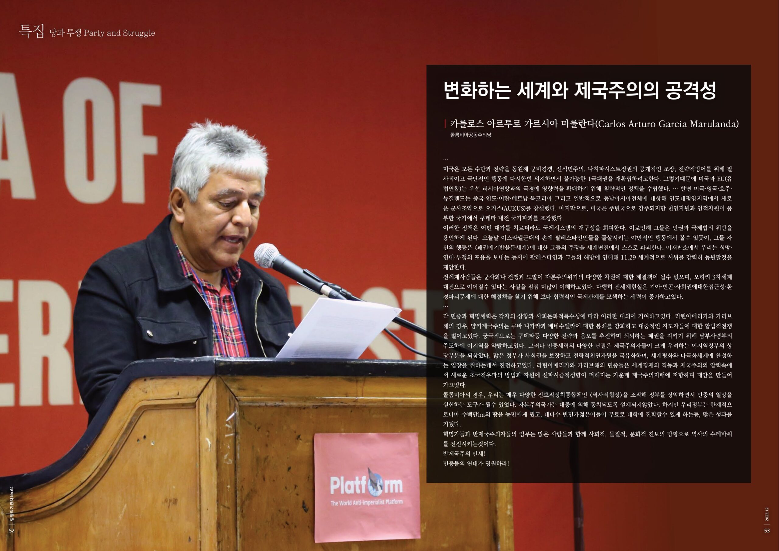 각 민중과 혁명세력은 각자의 상황과 사회문화적특수성에 따라 이러한 대의에 기여하고있다. 라틴아메리카와 카리브해의 경우, 양키제국주의는 쿠바·니카라과·베네수엘라에 대한 봉쇄를 강화하고 대중적인 지도자들에 대한 합법적전쟁을 벌이고있다. 궁극적으로는 쿠데타등 다양한 전략과 음모를 추진하며 쇠퇴하는 패권을 지키기 위해 남부사령부의 주도하에 이지역을 약탈하고있다. 그러나 민중세력의 다양한 단결은 제국주의자들이 크게 우려하는 이지역정부의 상당부분을 되찾았다. 많은 정부가 사회권을 보장하고 전략적천연자원을 국유화하며, 세계평화와 다극화세계에 찬성하는 입장을 취하는데서 진전하고있다. 라틴아메리카와 카리브해의 민중들은 세계경제의 격동과 제국주의의 압력속에서 새로운 초국적우파의 방법과 자원에 신파시즘적성향이 더해지는 가운데 제국주의지배에 저항하며 대안을 만들어가고있다.