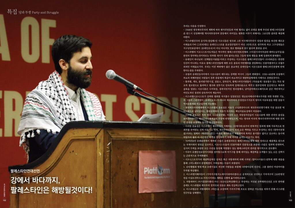 – 이러한 사실을 고려할때 모든 진보, 반제, 사회주의 세력은 팔레스타인민중의 편에 굳건하고 무조건적으로 서서 그들에 대한 실질적인 연대를 위해 모든 힘을 다해야할 의무가 있다.