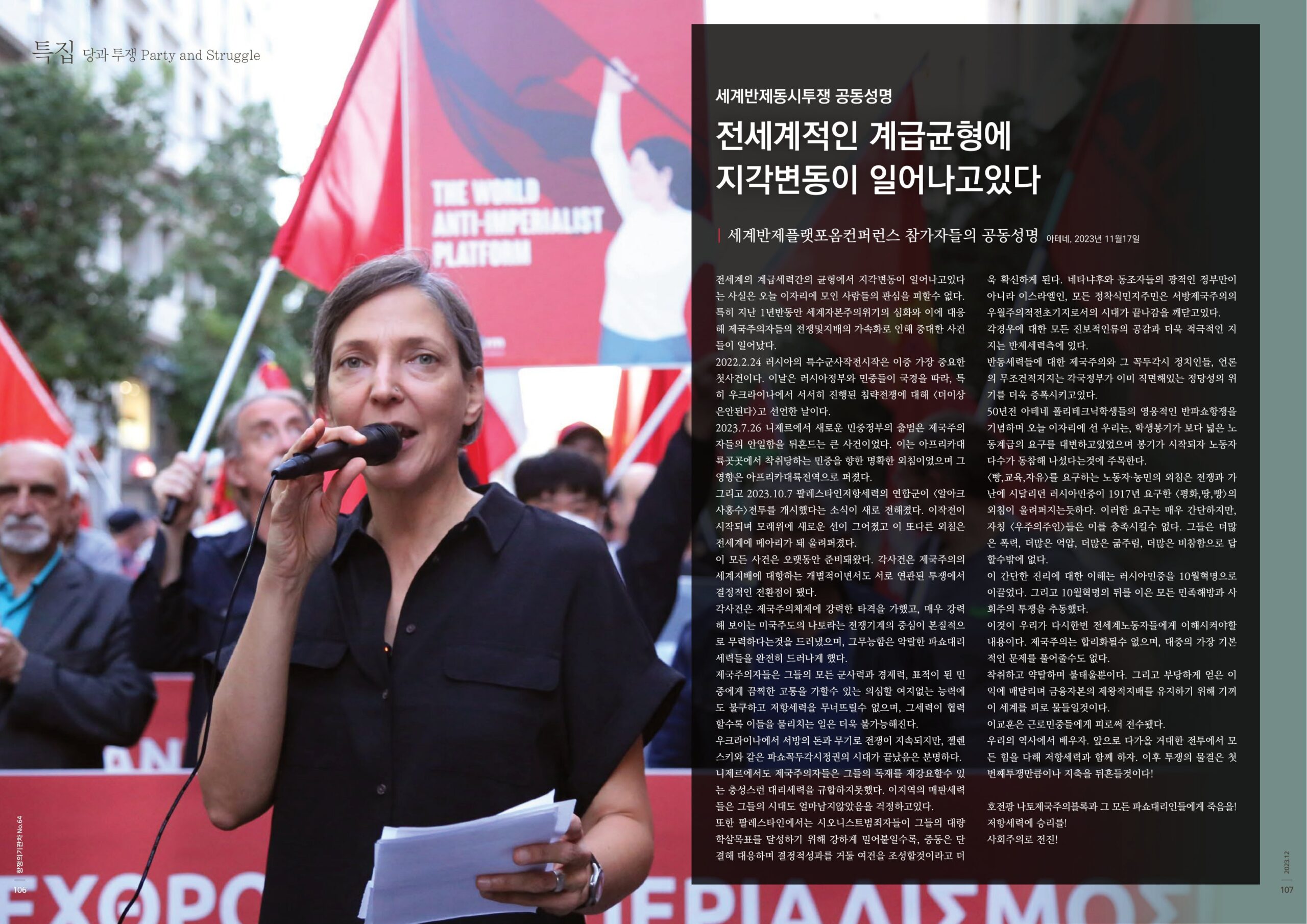 50년전 아테네 폴리테크닉학생들의 영웅적인 반파쇼항쟁을 기념하며 오늘 이자리에 선 우리는, 학생봉기가 보다 넓은 노동계급의 요구를 대변하고있었으며 봉기가 시작되자 노동자다수가 동참해 나섰다는것에 주목한다.