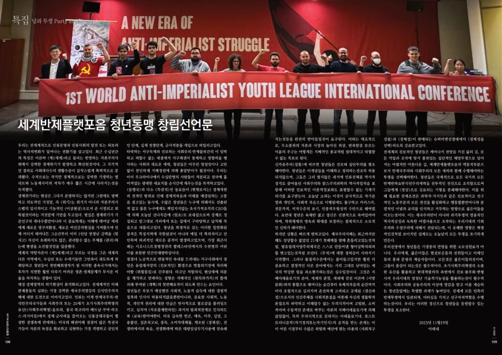 전세계의 진보적인 청년들은 깨어나서 전망을 가진 삶의 길, 모든 억압과 조작에 맞서 품위있는 집단적인 해방투쟁으로 일어서는 어렵지만 아름다운 길, 세계반제플랫포옴의 역동적부분으로서 반제국주의와 사회주의의 모든 세력과 함께 수행해야하는 투쟁을 선택해야한다. 청년들은 국제적으로 모든 국가의 모든 반제반파쇼반식민주의세력을 전투적인 전선으로 조직함으로써 그들에게 <정상>으로 강요되는 기형을 분쇄해야한다. 이를 위해 필요한 전제조건은 과학자·지식인과 같은 진보적이고 선구적인 노동부문의 모든 전선을 활성화하고 행동할뿐만아니라 분열적인 이념과 교리를 인식하고 거부하는 방향으로 젊은이들을 이끄는것이다. 이는 제국주의만이 아니라 과거투쟁의 영웅적인 역사적상징과 독특한 어법사용으로 조작하는 우리시대의 기회주의와 수정주의에 의해서 전달되는데, 이 유해한 영향은 혁명적인것처럼 보이지만 실제로는 오늘날의 모든 투쟁을 포기하게 만든다.